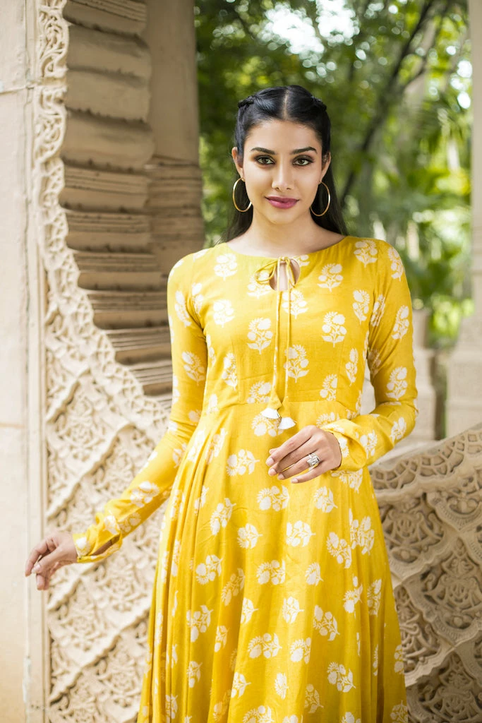 Muslin silk fabric has subtle sheen and luminous drape, apt for a silhouette like this. Closed round neck with keyhole and tie-ups, do not miss the beautiful white thread tassel detail.