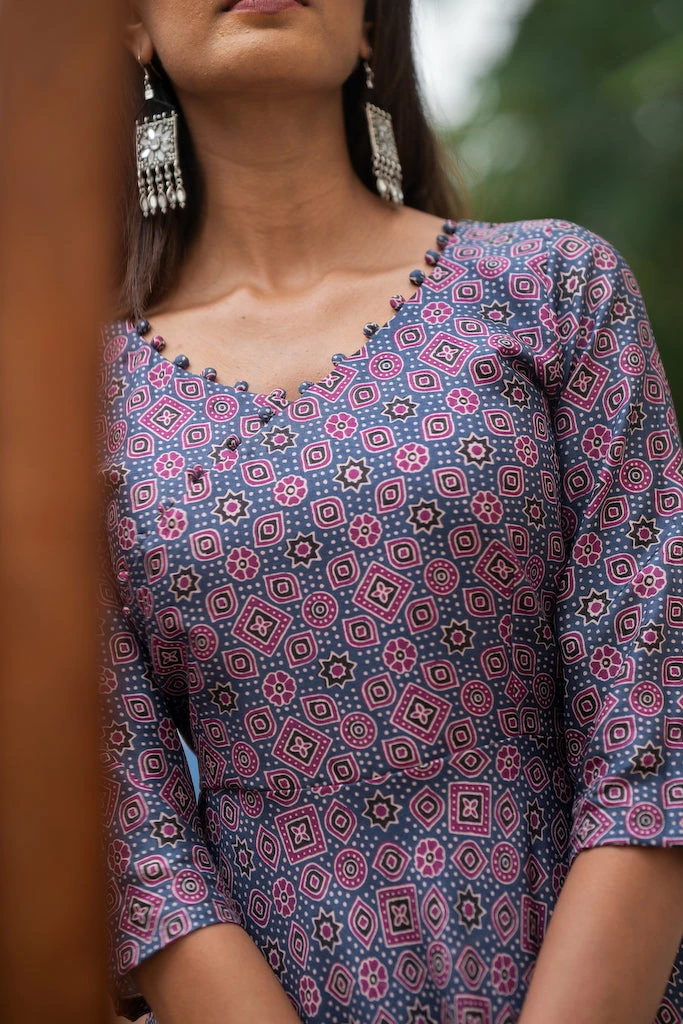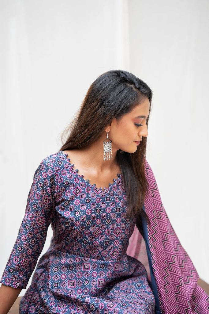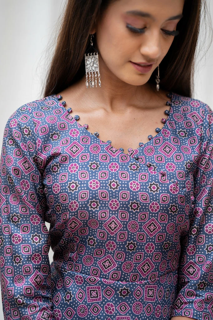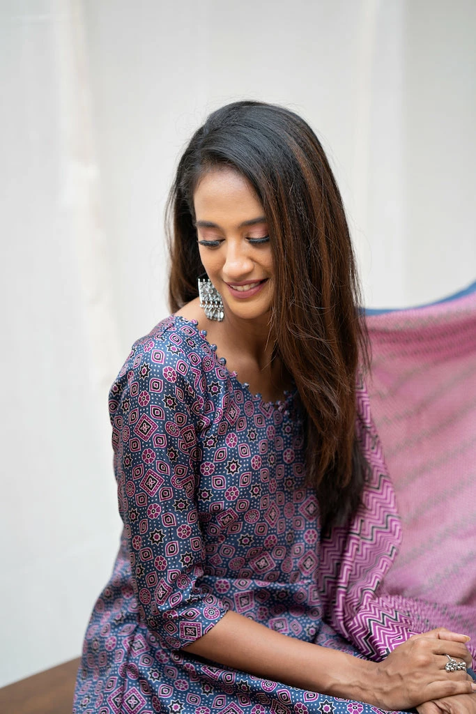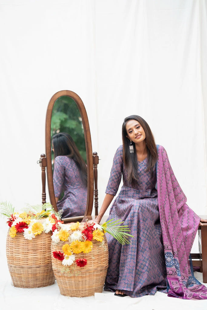 SUMMER is here!!! ..Lets get the Ajrakh party started. This Fit & flare Anarkali is a perfect blend of authenticity and feminity as it has traditional ajrakh all over print in rustic hues elevated by flattering cross over neckline with potli button detail. The semi tussar fabric has a mild sheen which adds to the beauty of the entire look.The chevron print soft silk dupatta with ajrakh print as the border Completes the ensemble.