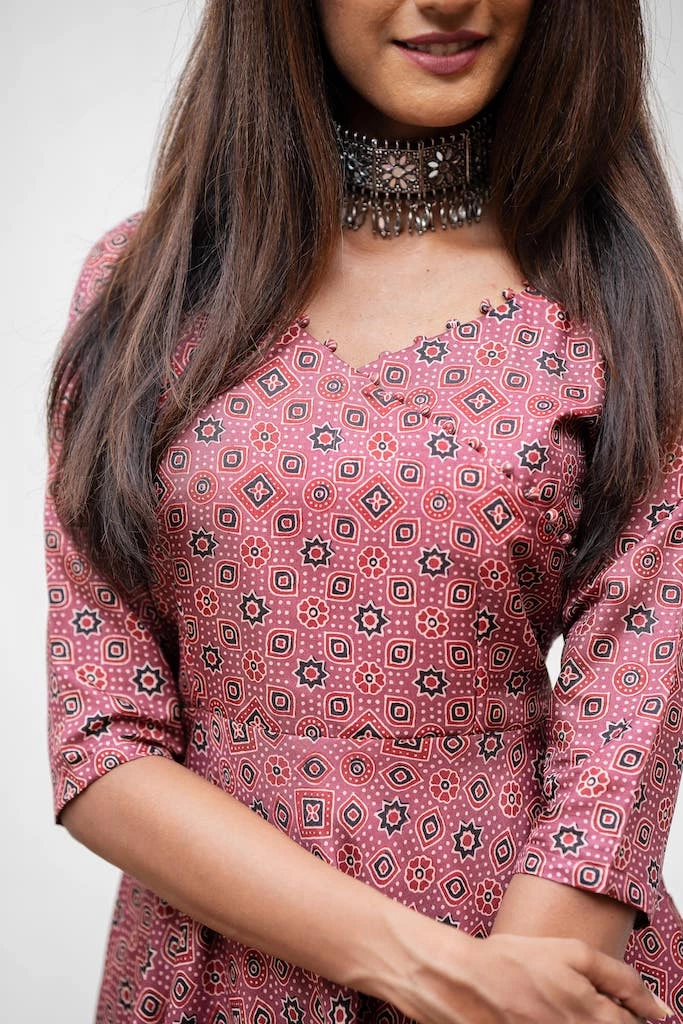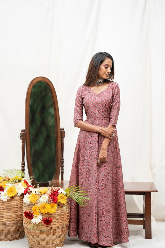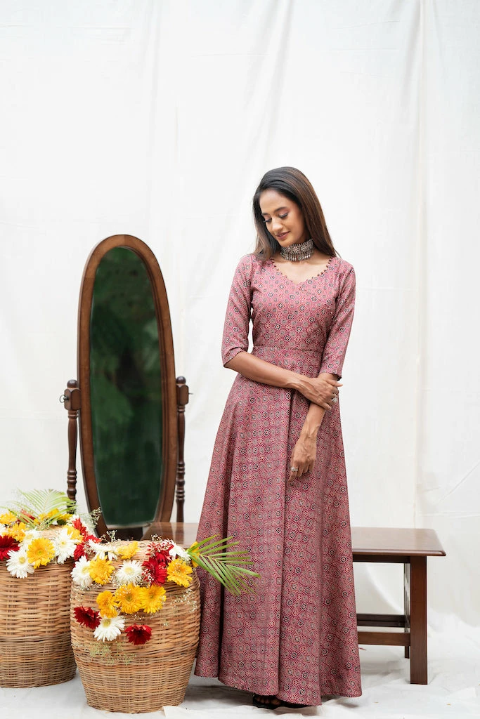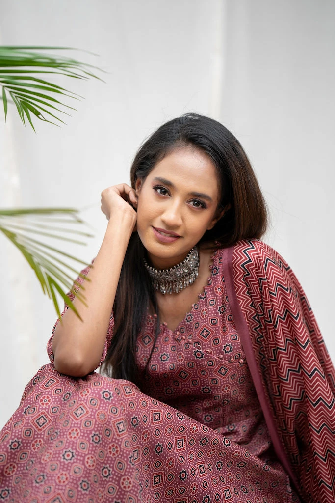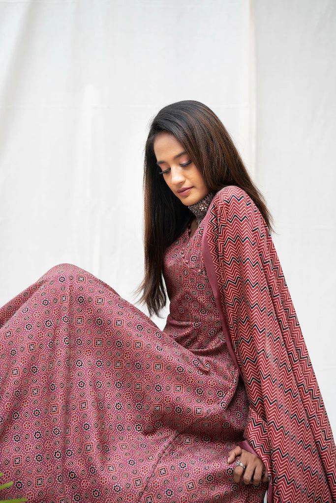 SUMMER is here!!! ..Lets get the Ajrakh party started. This Fit & flare Anarkali is a perfect blend of authenticity and feminity as it has traditional ajrakh all over print in rustic hues elevated by flattering cross over neckline with potli button detail. The semi tussar fabric has a mild sheen which adds to the beauty of the entire look.The chevron print soft silk dupatta with ajrakh print as the border Completes the ensemble.