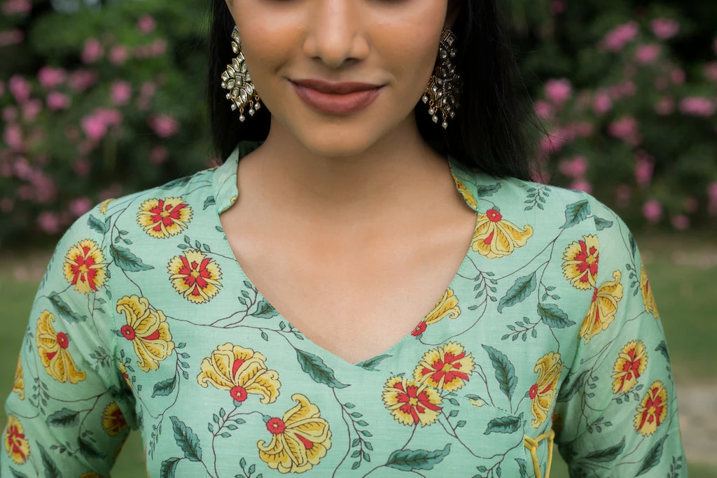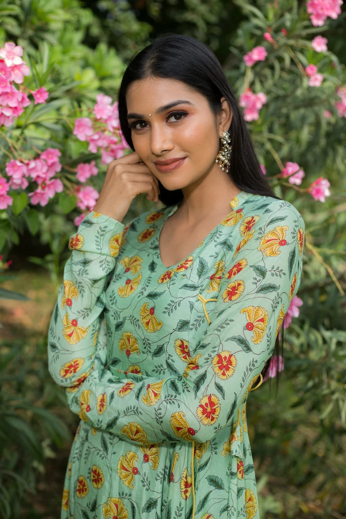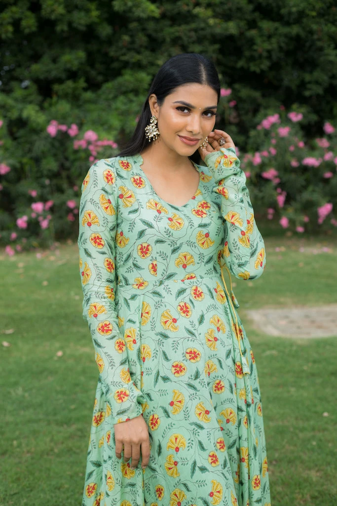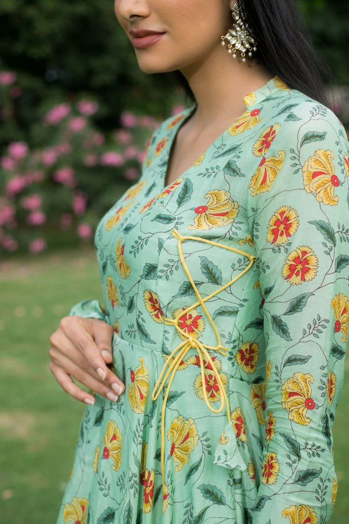An amalgamation of intricate patterns printed on rich Muslin silk fabric. This floor length Angrakha Anarkali comes in beautiful pastel shades, contrast tie up details and fitted full sleeves. The dress is fully lined.