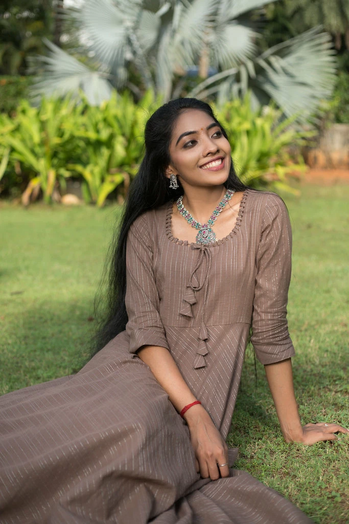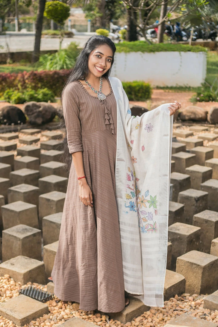 Flaunt elegance in this breezy Lurex anarkali paired with a Linen floral print dupatta. The shiny yarns woven throughout add a touch of bling to your style. ‘U’ neck with loops and tie up details compliments the silhouette and makes it a Summer classic beauty. Linen Off-white base with multi color floral print dupatta will surely make heads turn! Â