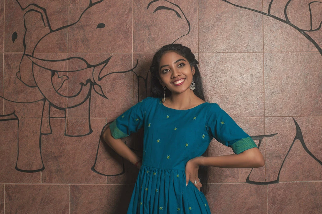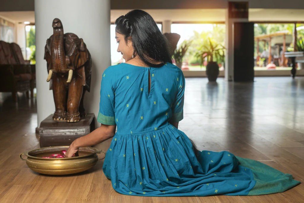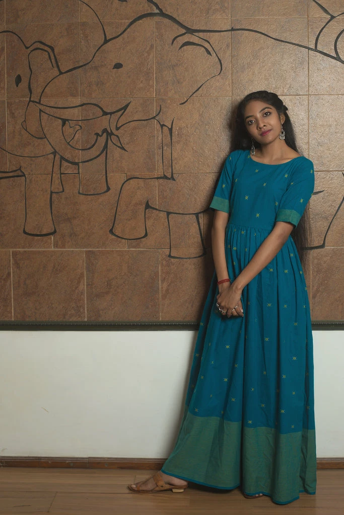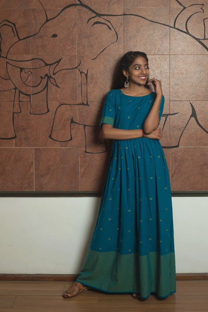 Slay the casual style with our Cotton Maxi dress. Experience the comfort of soft fabric and contemporary Indian motifs woven along with a contrasting border in this perfect day dress. With fitted elbow sleeves, gathered waist line and closed U neck this look screams Comfort !
