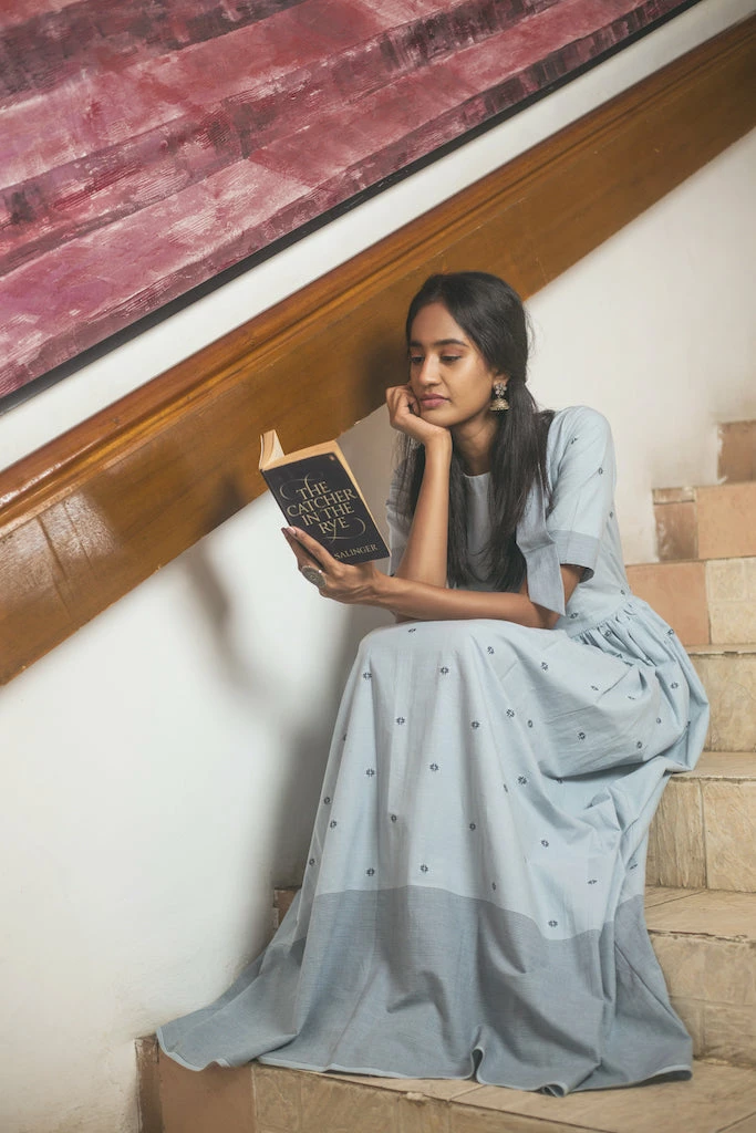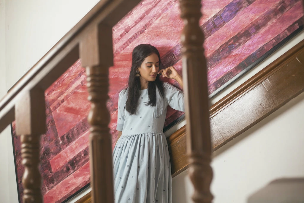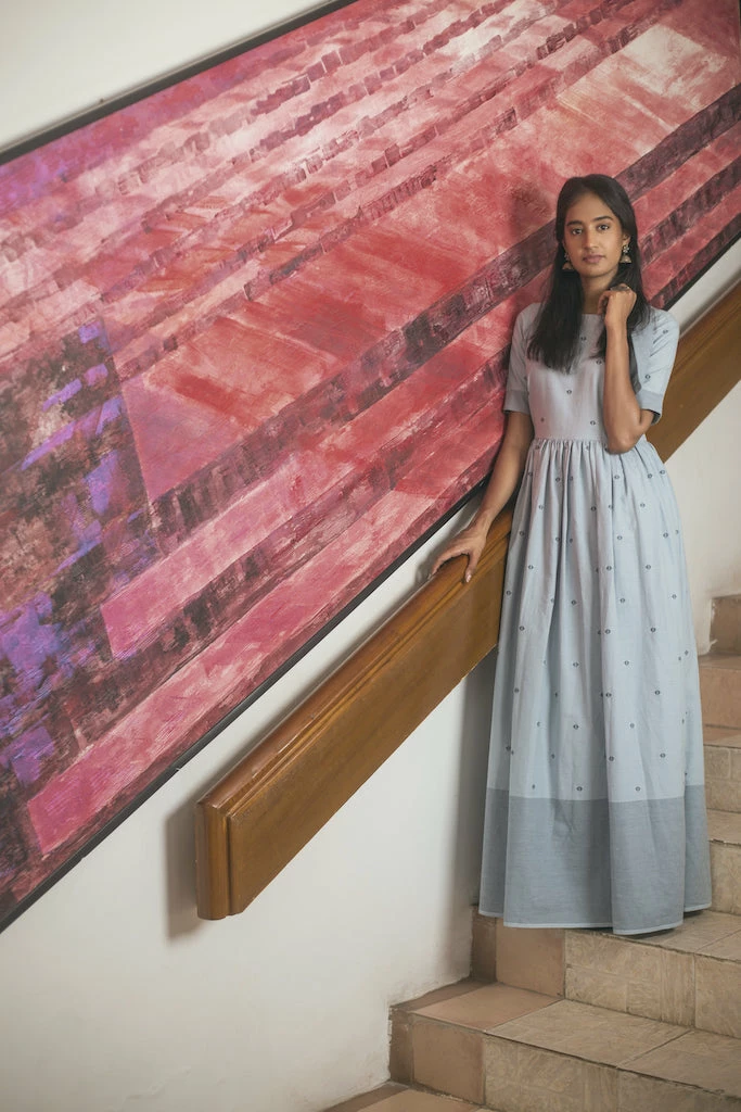 Slay the casual style with our Cotton Maxi dress. Experience the comfort of soft fabric and contemporary Indian motifs woven along with a contrasting border in this perfect day dress. With fitted elbow sleeves, gathered waist line and closed U neck this look screams Comfort !