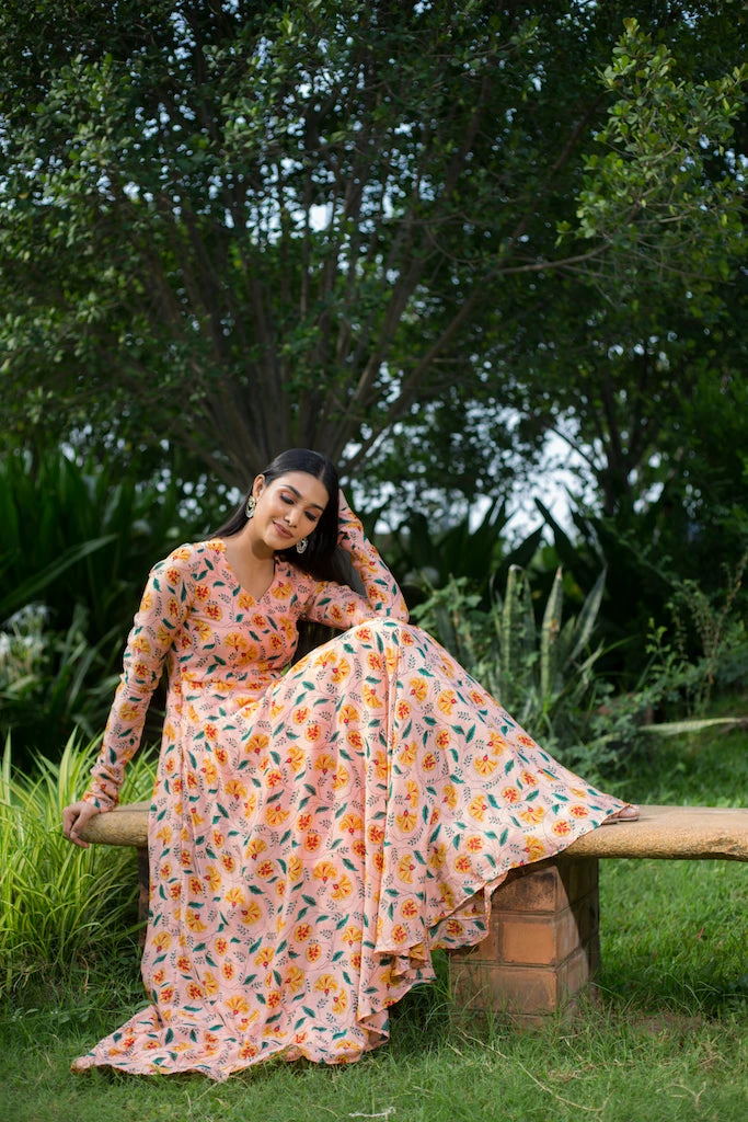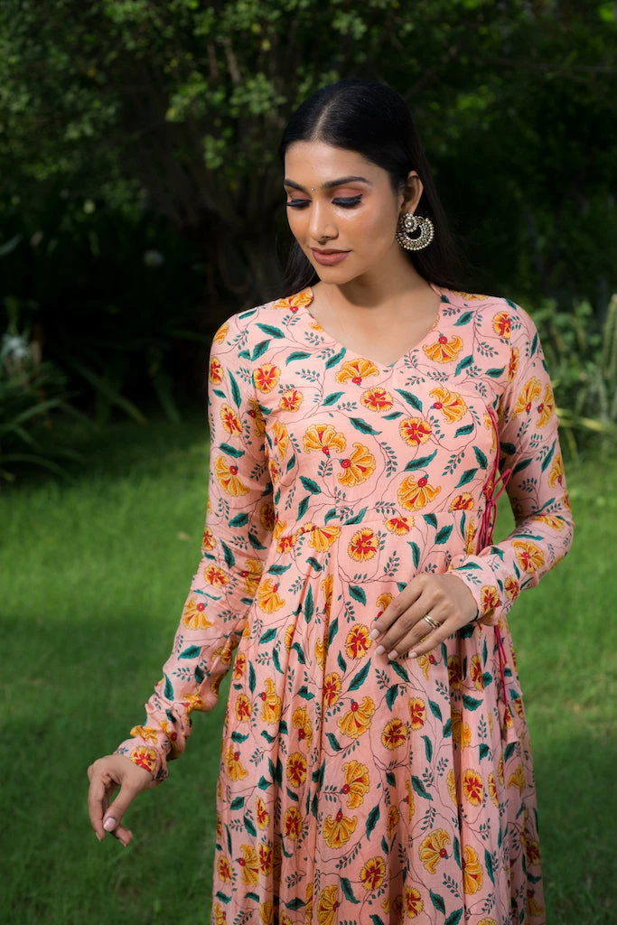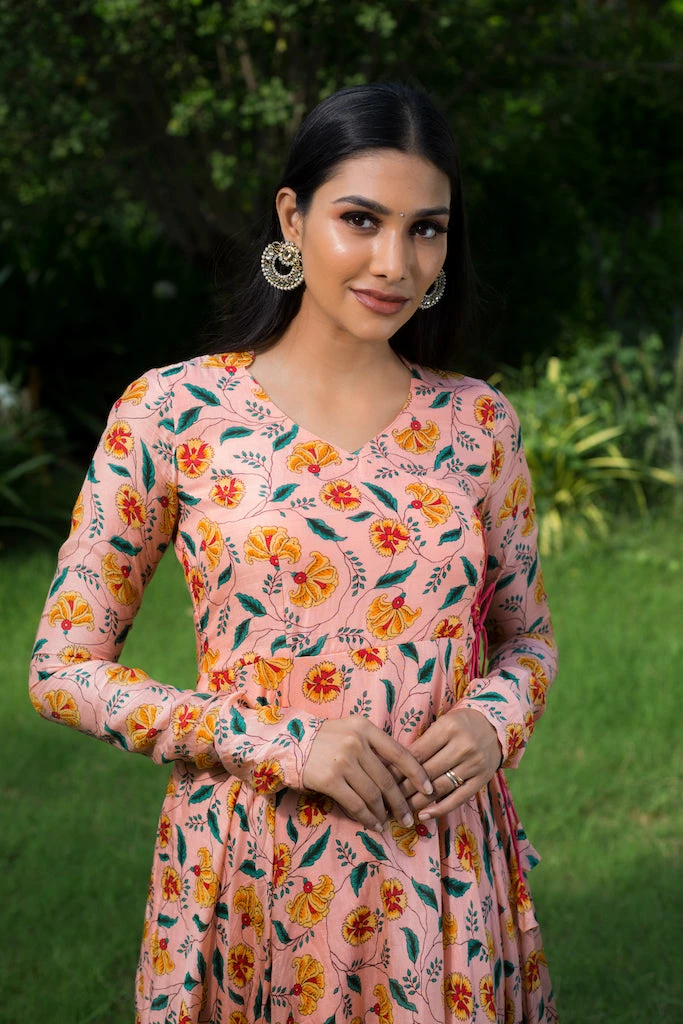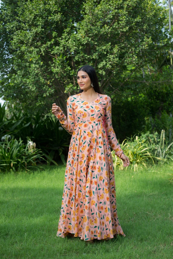 An amalgamation of intricate patterns printed on rich Muslin silk fabric. This floor length Angrakha Anarkali comes in beautiful pastel shades, contrast tie up details and fitted full sleeves. The dress is fully lined.