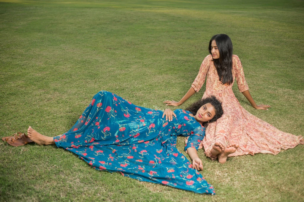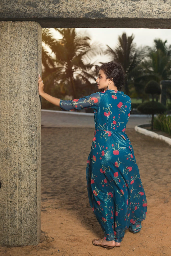 Indulge in shimmering fashion statement. This magnificent floral printed dress is a light-weight ensemble with lots of flare, the zari details & Potli buttons add beauty to this dress. Wide ‘V’ neck with mandarin collar accentuates the neck.