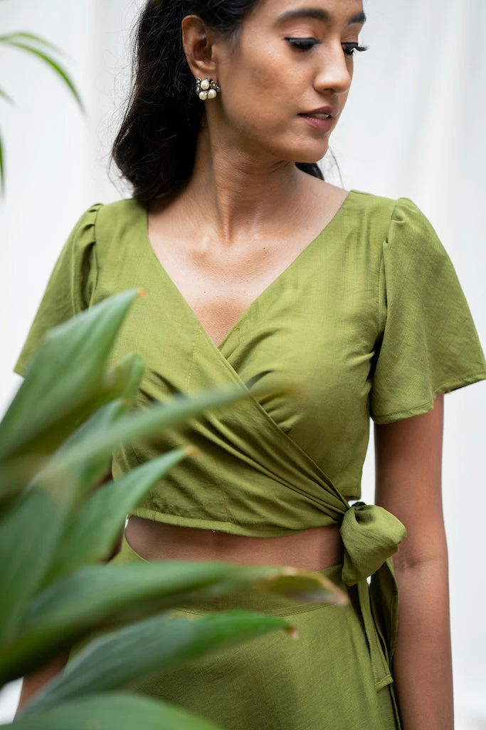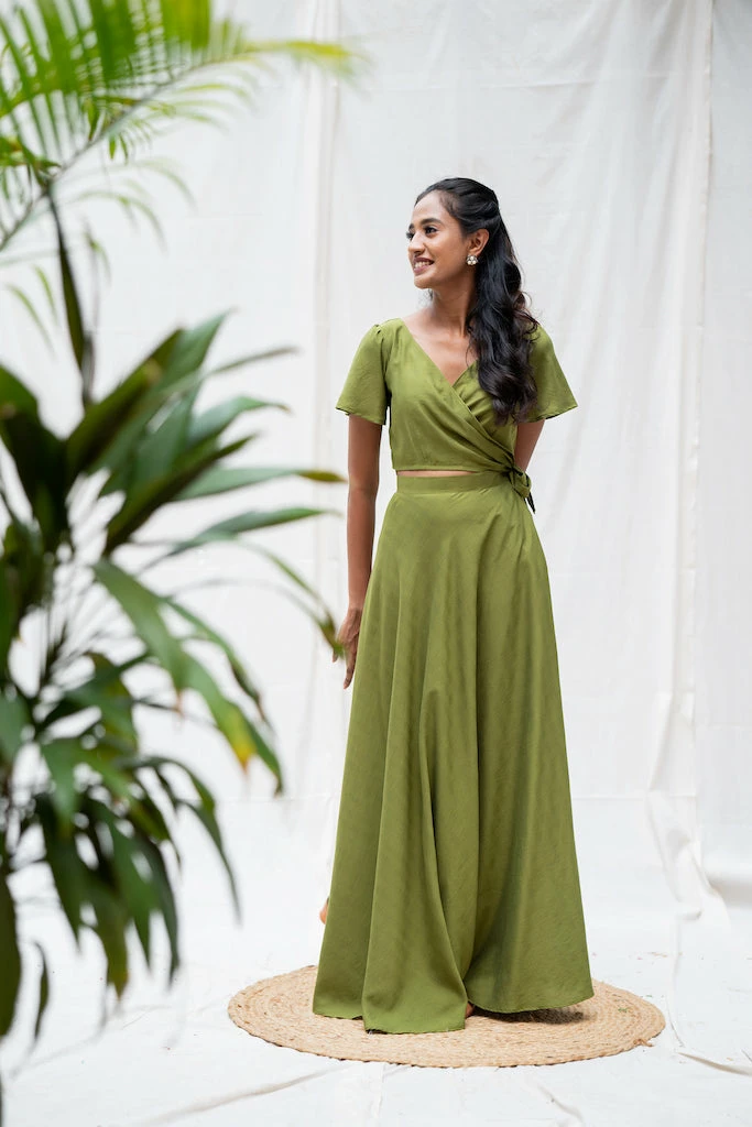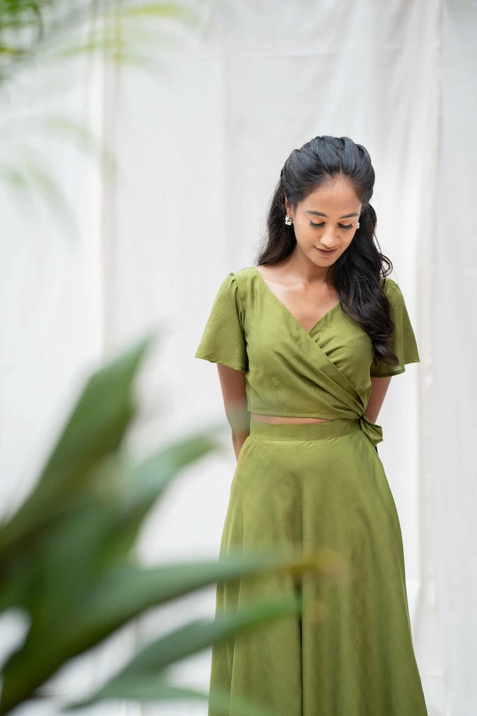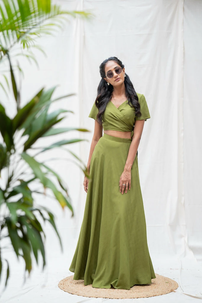 Easy, comfortable & Stylish that is MOUNA co-ord set. Made using Cotton viscose fabric which is flowy and highly breathable. With a versatile wrap blouse paired with short sleeves and flared skirt you can swirl around in comfort. Take those tie-ups and style them your way.