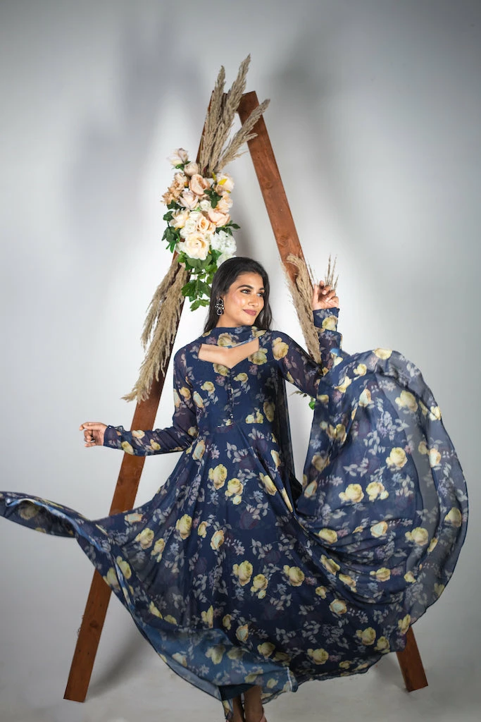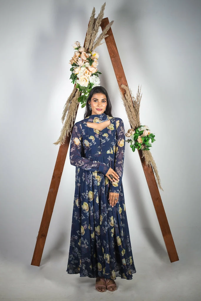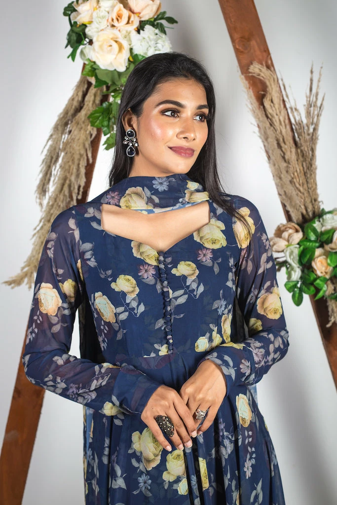 This floral printed georgette anarkali is all set to steal the show with its flattering sweet heart neckline, potli buttons detail and full length crushed sleeves.The flowy silhouette and magnificent colours is a perfect blend of elegance and feminity.