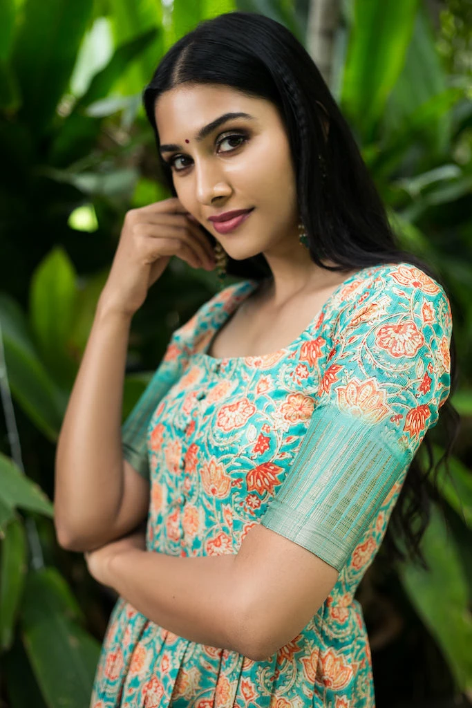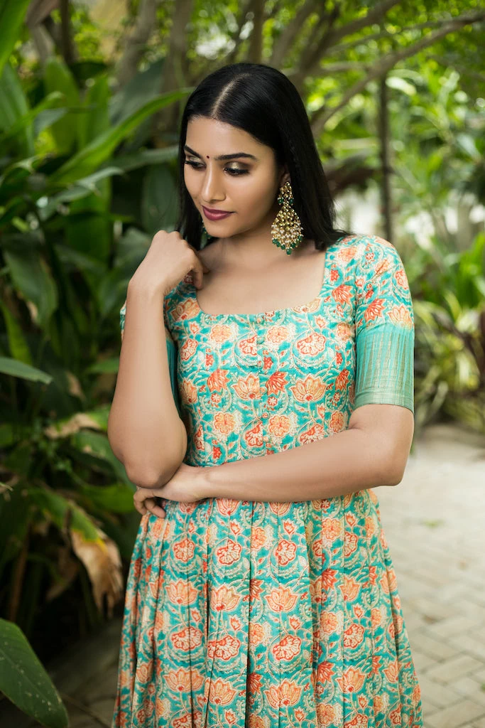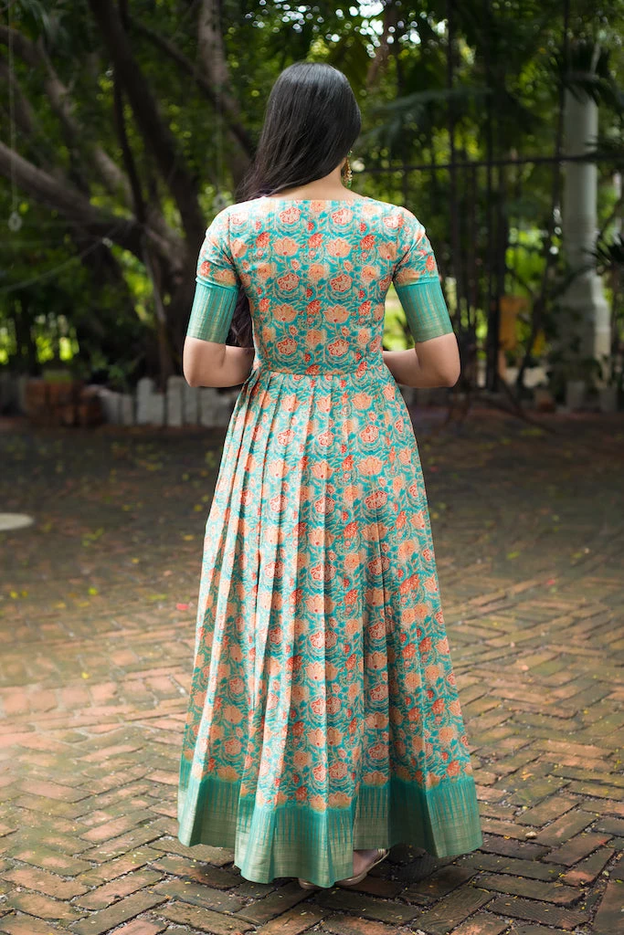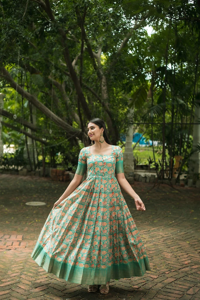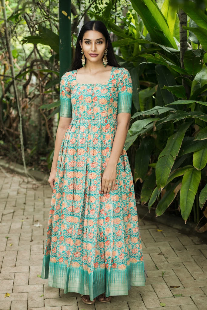 The floor length fitted Dress is made using Semi tussar fabric, which has fine luster and drapes so beautifully when worn. Dull gold Ghicha border at the hemline and sleeves elevates the look. U neck with potli button details on the yoke, fitted elbow sleeves and knife pleats adds to the sophistication. With unique color combinations and prints this outfit is set out to steal the show.