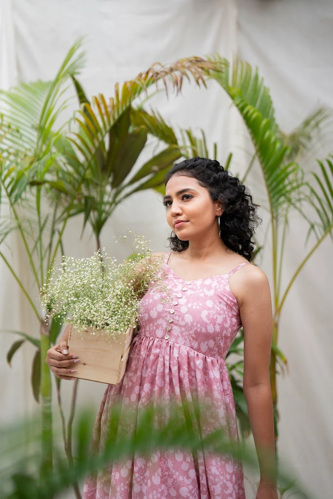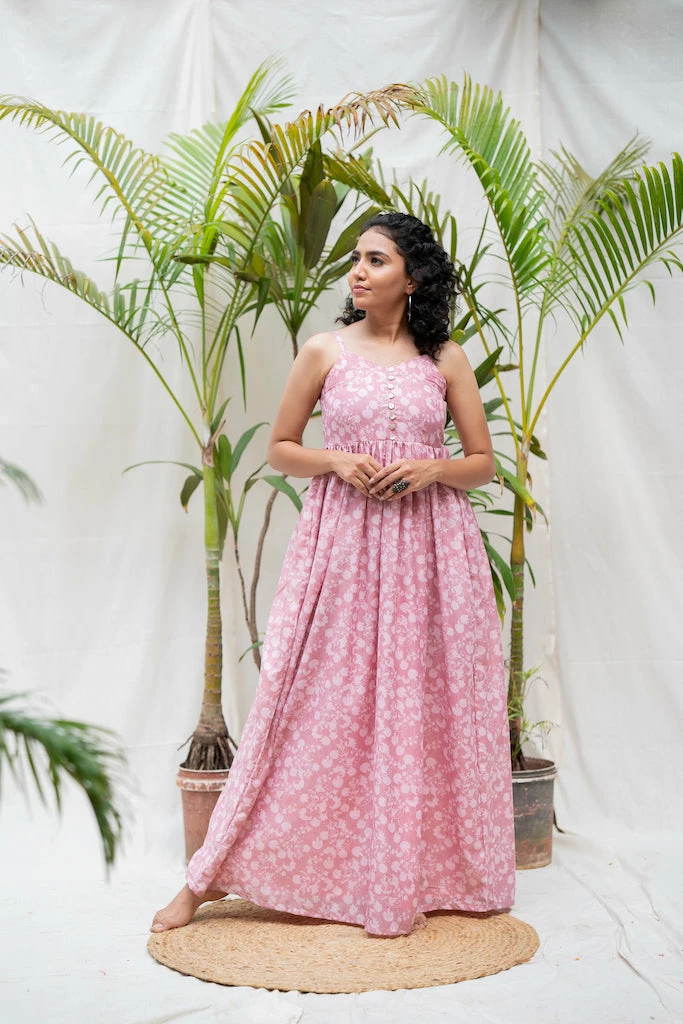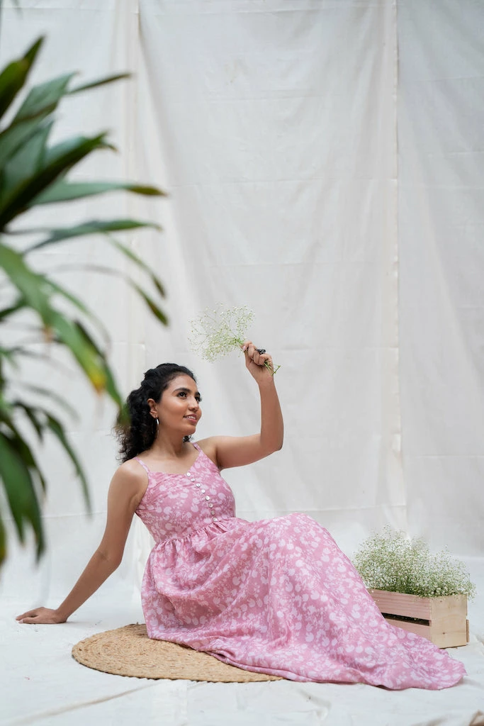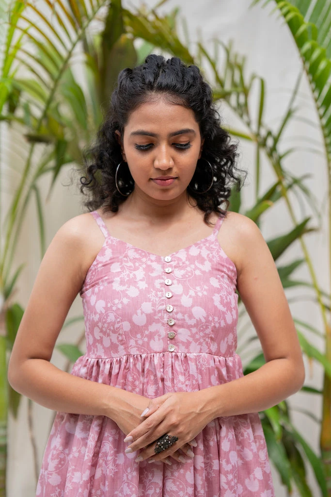 Let’s get a relaxed holiday vibe in our ZOYA. This Muslin silk strap dress, with gathered waist line, flattering sweetheart neckline, fabric loops and shell buttons gives you a fun and modern look. Fabric is so light weight and flowy making ZOYA a comfortable ready to go dress.Â