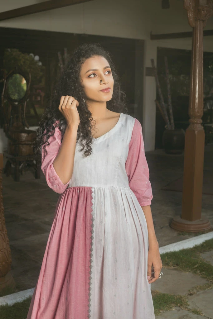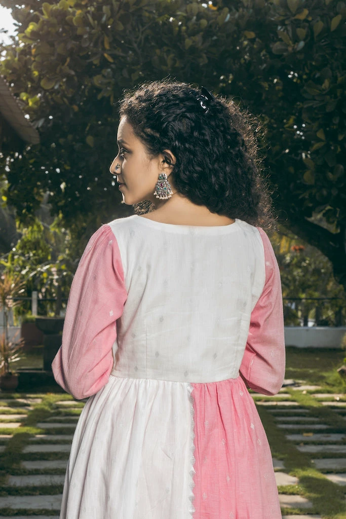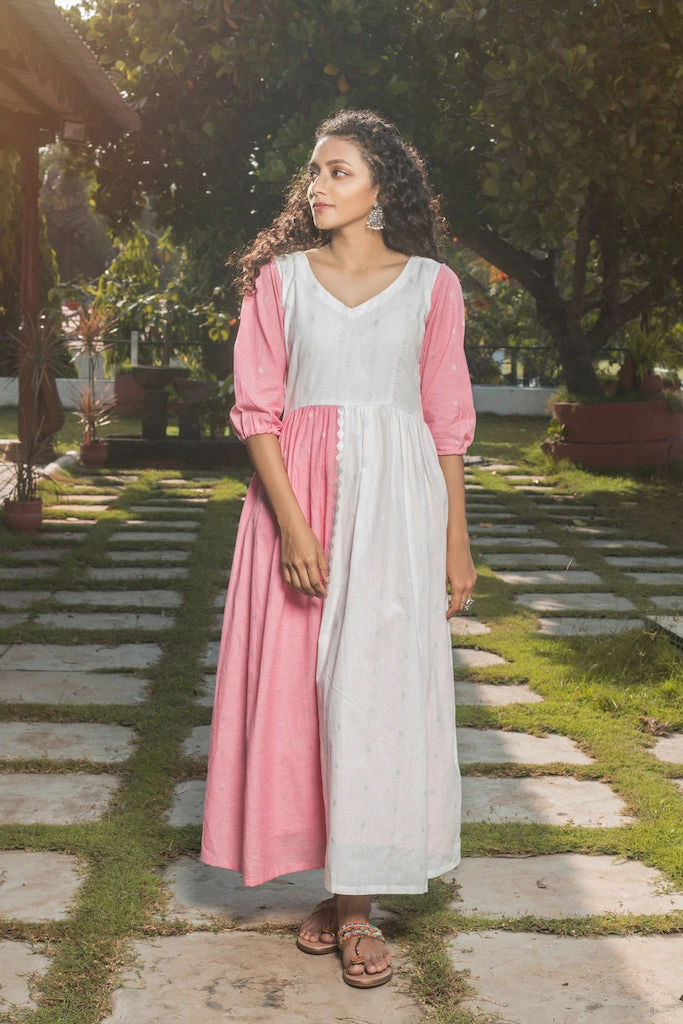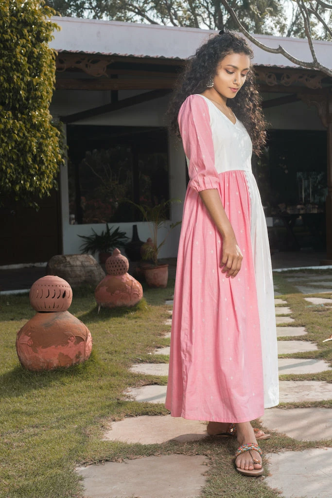 Experience the best of two worlds in this dual shaded handloom cotton dress. Shades of Pink & White merge in this ankle length dress with all time favourite peasant sleeves. The rich Silver zari motifs woven all over brings in a voguish charm.