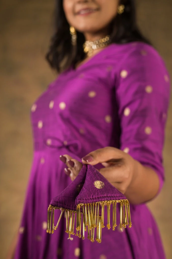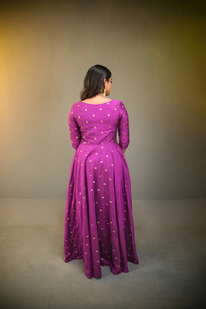 Experience grandeur and luxury in this floor length silk dress. The fabric has a rich texture with gold zari buttas woven. Deep V, and dori details adds beauty to this angrahka style dress. If you are looking for a classy yet traditional outfit for the upcomong festivities then DO NOT miss INAYA!!Â