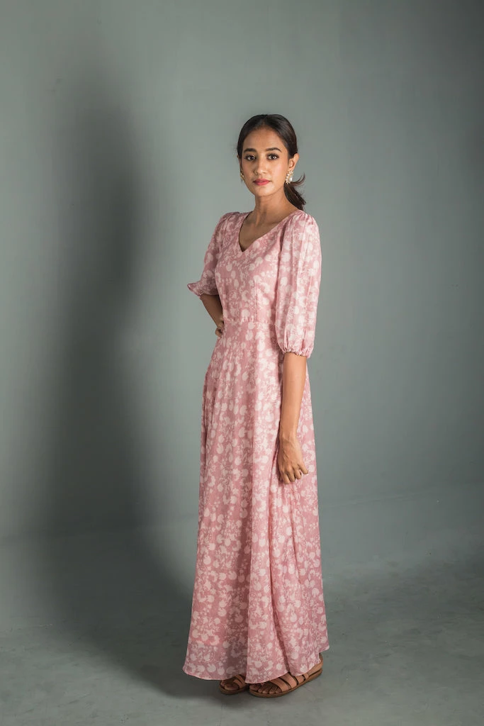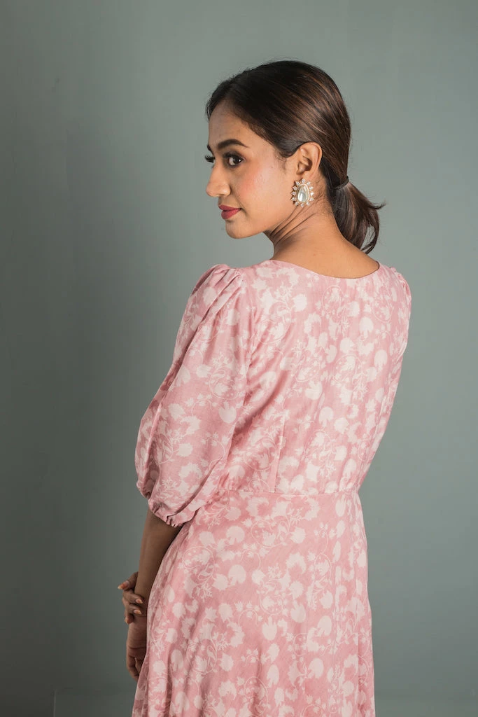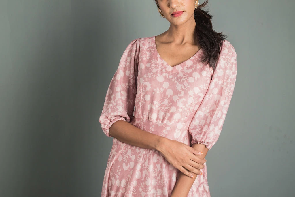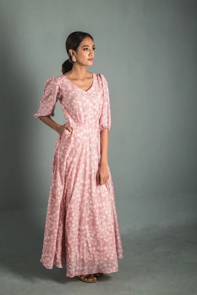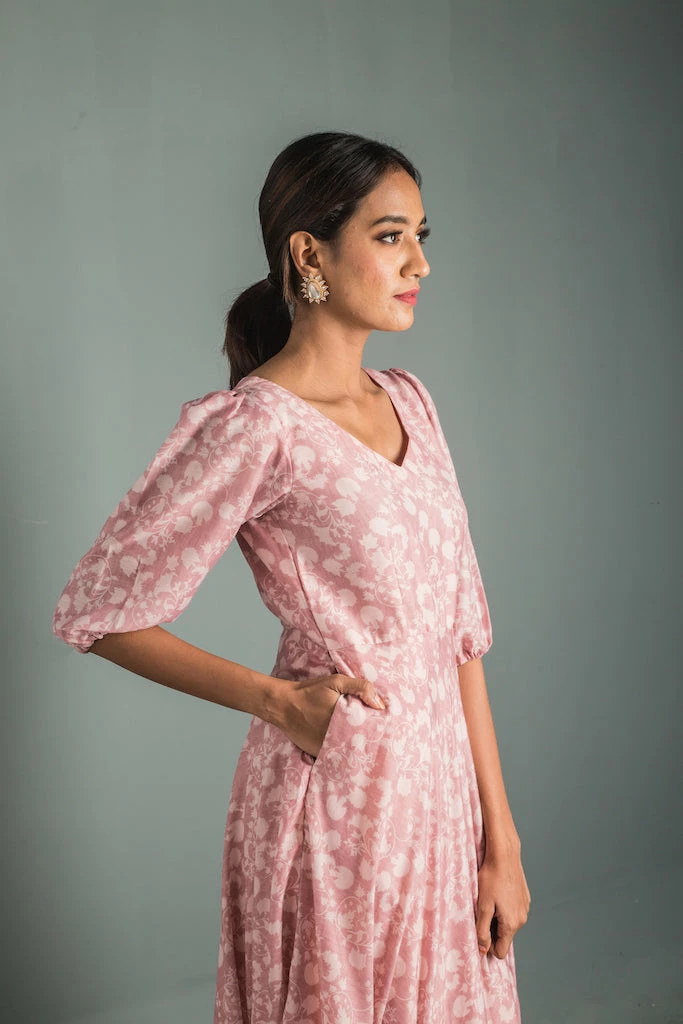 This ankle length midi dress is a curation of casual style and comfort. The Muslin silk fabric is light, flowy and has a subtle sheen which elevates the minimalistic silhouette with V neck, pocket peasant sleeves.Flaunt a casual and breezy look with pretty prints and soothing hues.!!