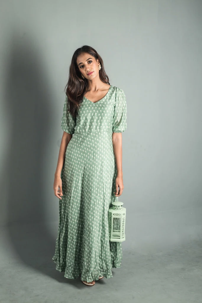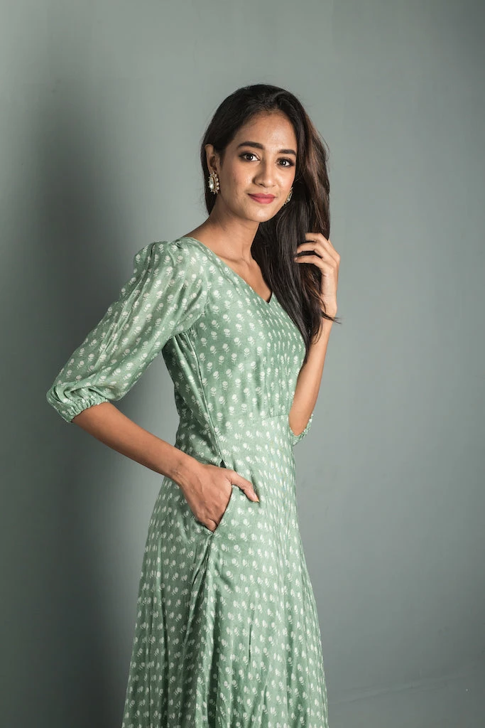This ankle length midi dress is a curation of casual style and comfort. The Muslin silk fabric is light, flowy and has a subtle sheen which elevates the minimalistic silhouette with V neck, pocket and peasant sleeves.Flaunt a casual and breezy look with pretty prints and soothing hues.!!