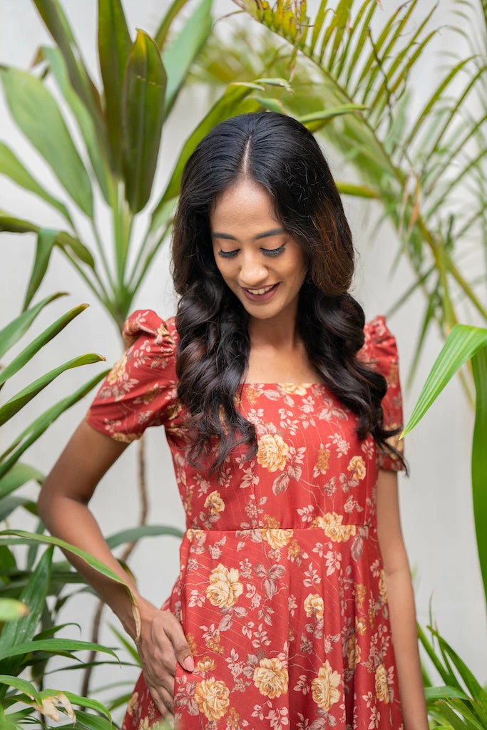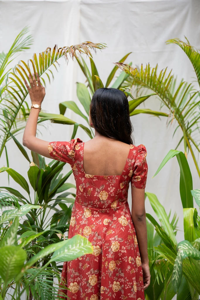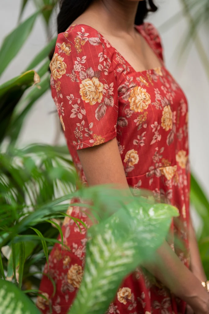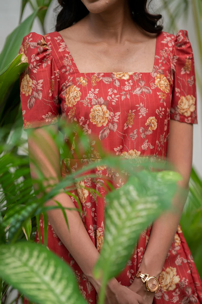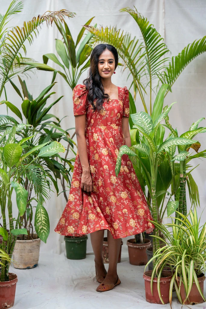 Vintage floral pattern combined with toned down rustic colors. Khatija, a cute midi dress ideal for a brunch with your gal pals or a romantic dinner date. Made from rich Chanderi lurex fabric with mild sheen drapes beautifully on the body. With sharp Square neckline and 8o’s pleated puff sleeve paired with functional pocket makes it a must have summer dress.