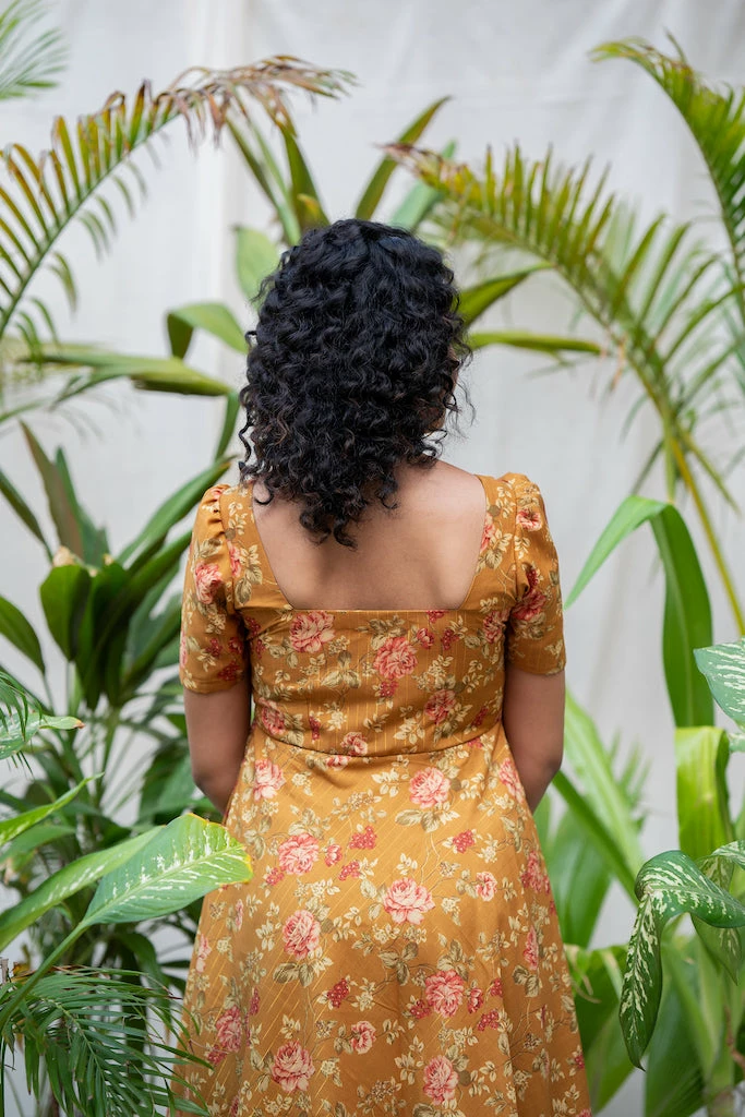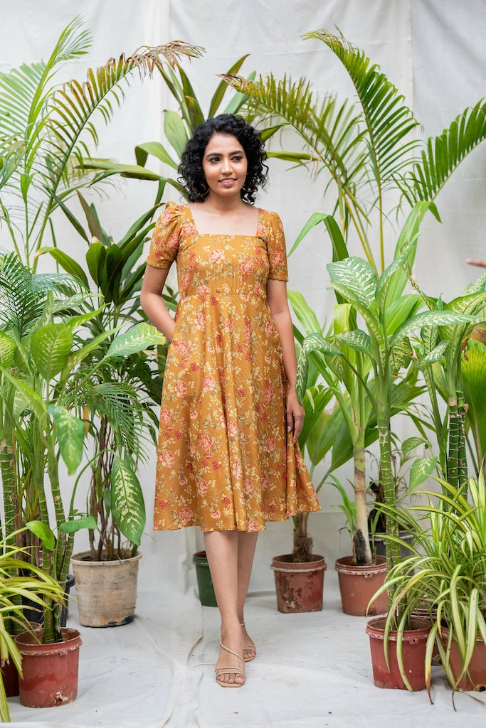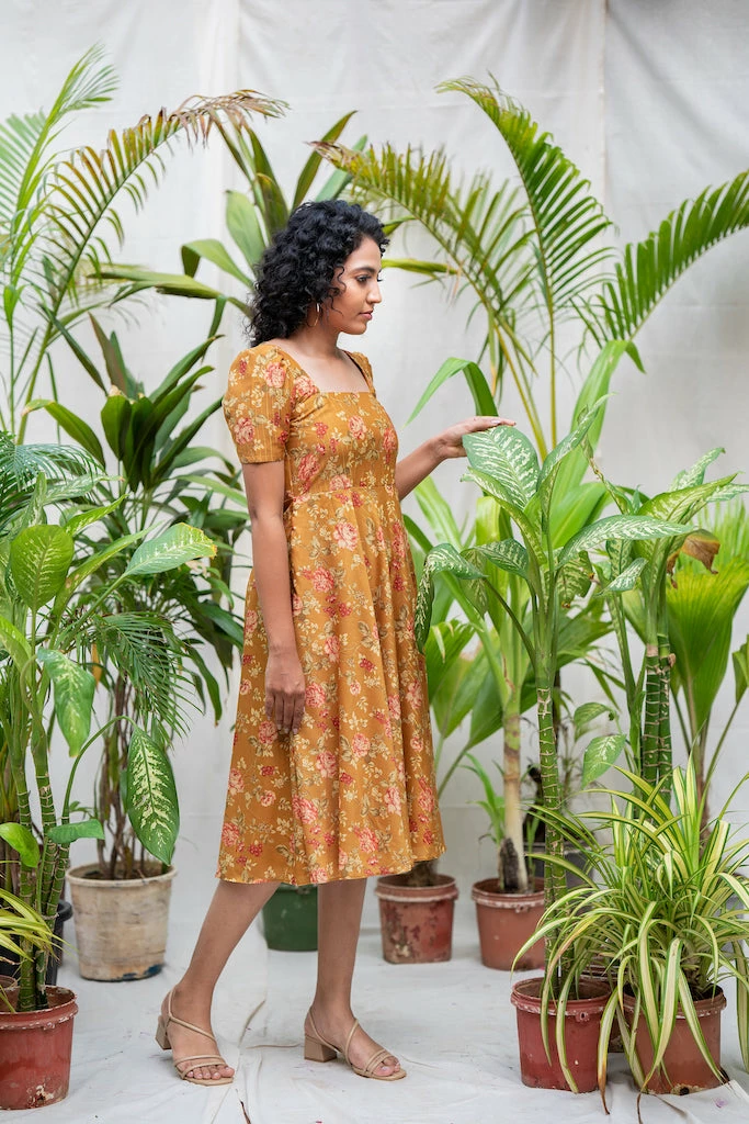 Vintage floral pattern combined with toned down rustic colors. Khatija, a cute midi dress ideal for a brunch with your gal pals or a romantic dinner date. Made from rich Chanderi lurex fabric with mild sheen drapes beautifully on the body. With sharp Square neckline and 8o’s pleated puff sleeve paired with functional pocket makes it a must have summer dress.