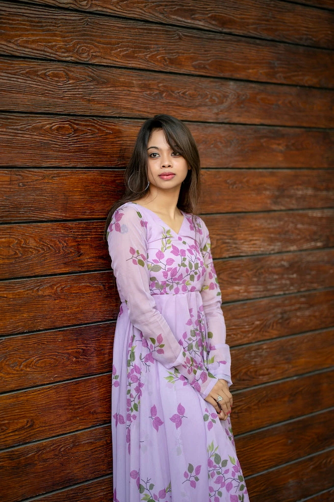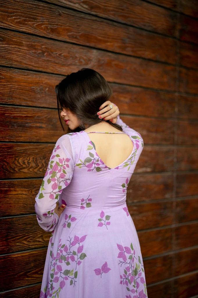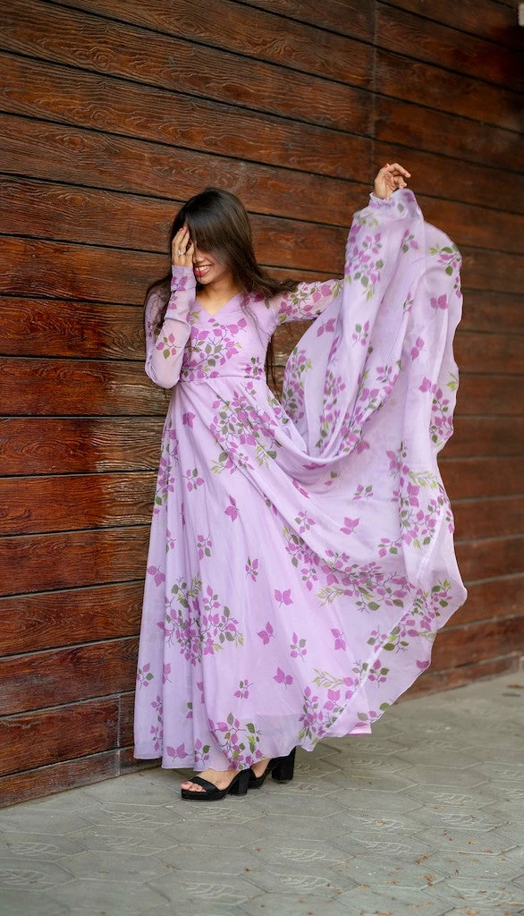 Experience the best of comfort with our exclusive Silk Organza floor length dress. Beauty of the flare and subtlety of hues in this ensemble is accentuated with overlapped yoke and gathered full sleeves. The dreamy floral prints all over adds a sophisticated touch to this piece.Â