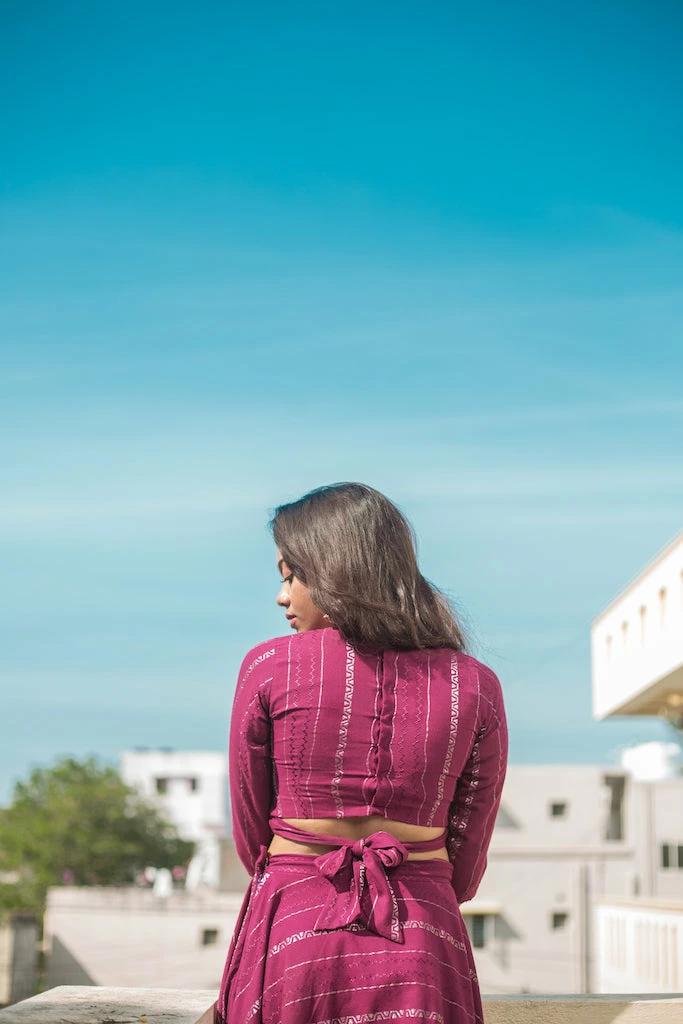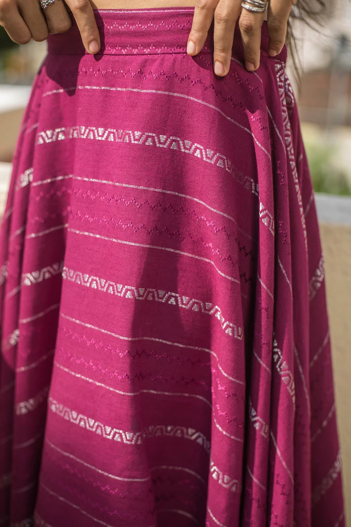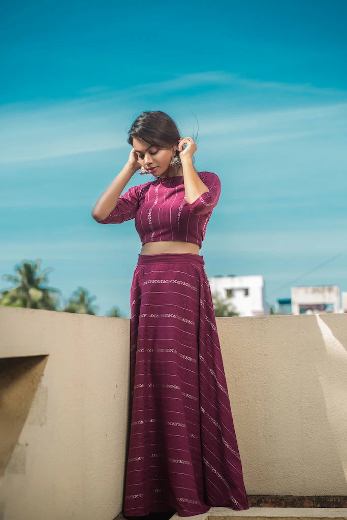 A modern twist to this dainty hand-picked South Indian weave.This majestic ensemble in the lively colour combination of Purple and Silver has a well fitted crop top with a fancy tie-up at the back .Circular cut skirt with lots of flare, you would not want to stop twirling. Stand out in the sophisticated charm of this must-style beauty.