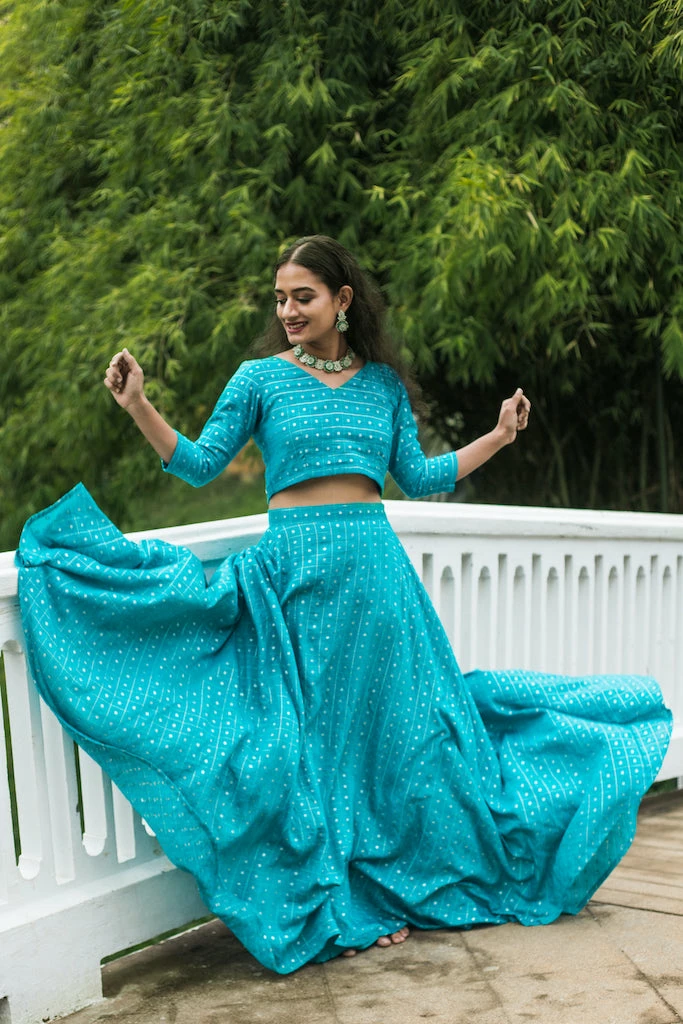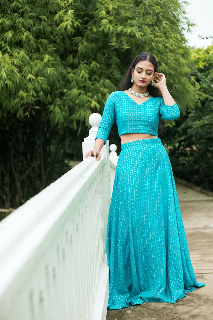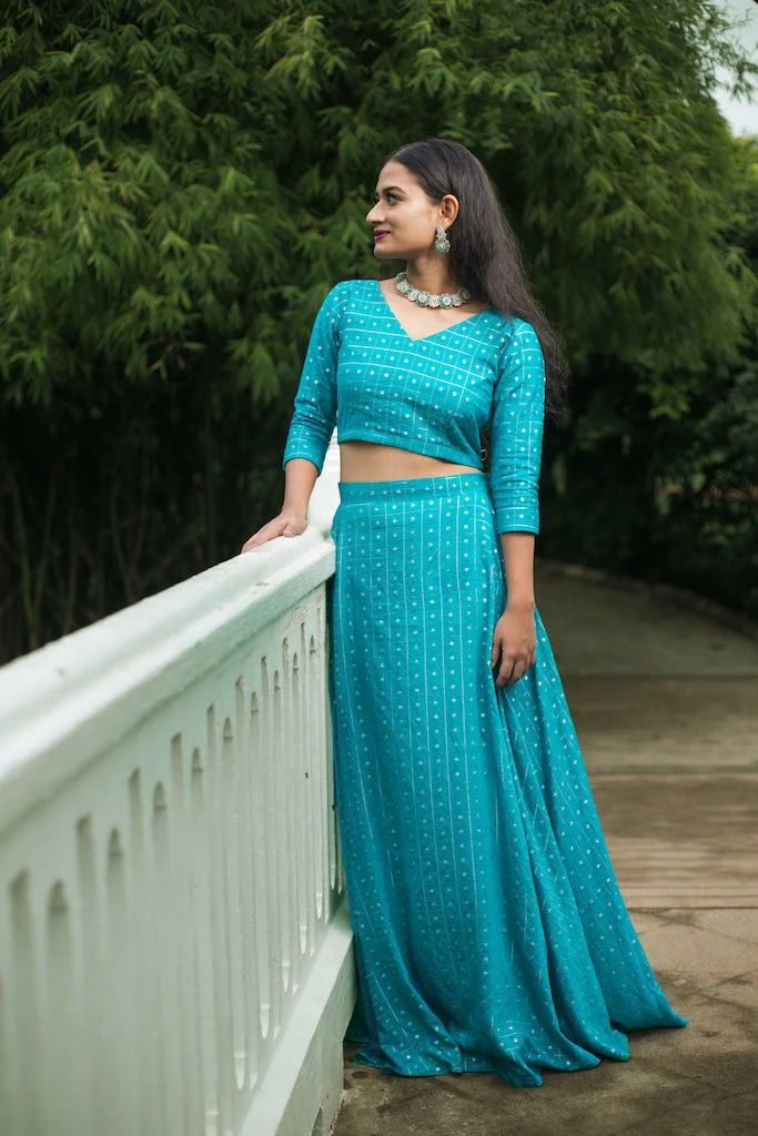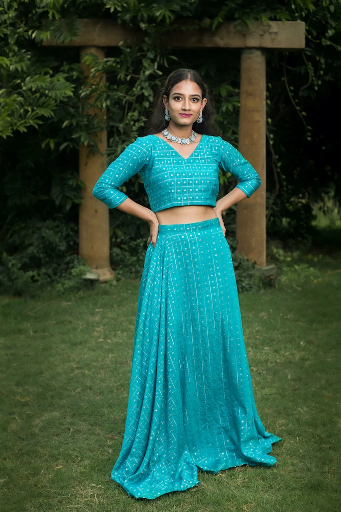 Majestic flared skirt with gorgeous sheen, fitted crop top with classic V neck and 3/4th sleeves is a must have in your wardrobe.