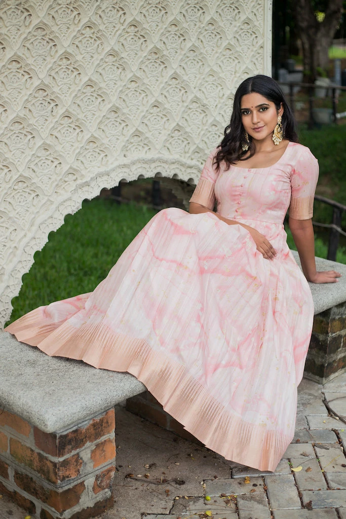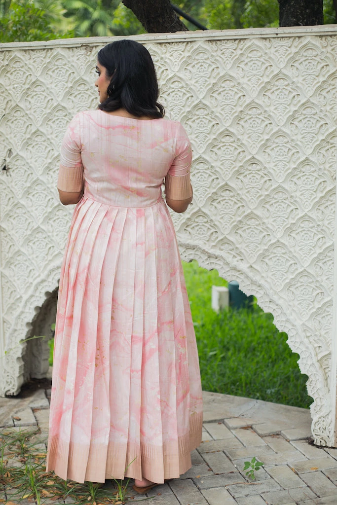 The floor length fitted Dress is made using Semi tussar fabric, which has fine luster and drapes so beautifully when worn. Dull gold Ghicha border at the hemline and sleeves elevates the look. U neck with potli button details on the yoke, fitted elbow sleeves and knife pleats adds to the sophistication. With unique color combinations and prints this outfit is set out to steal the show.