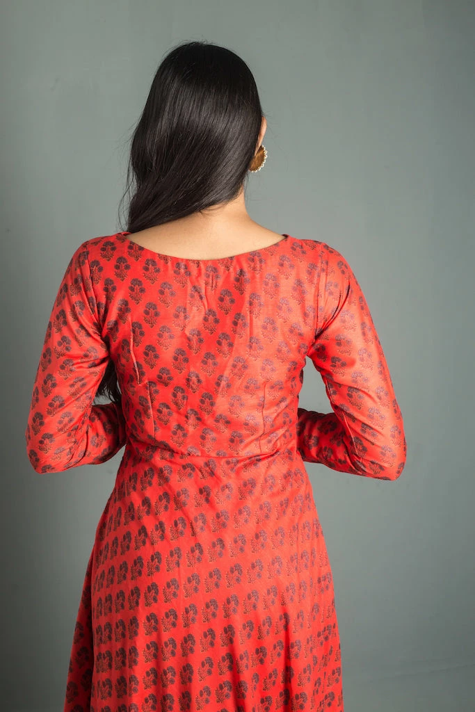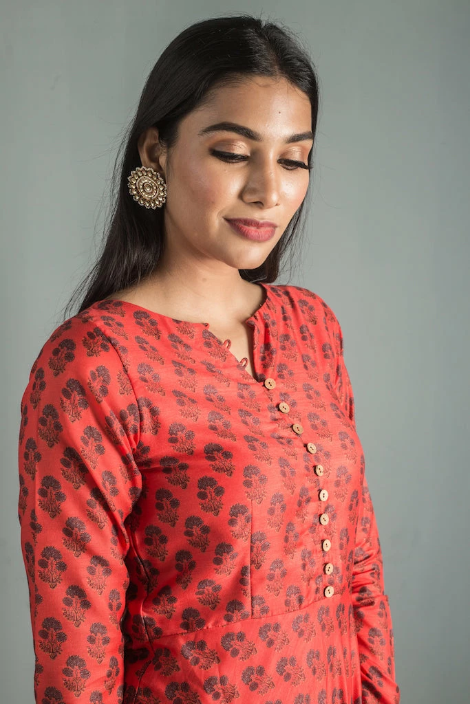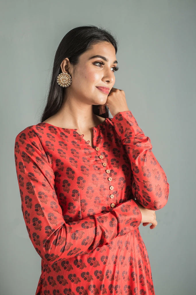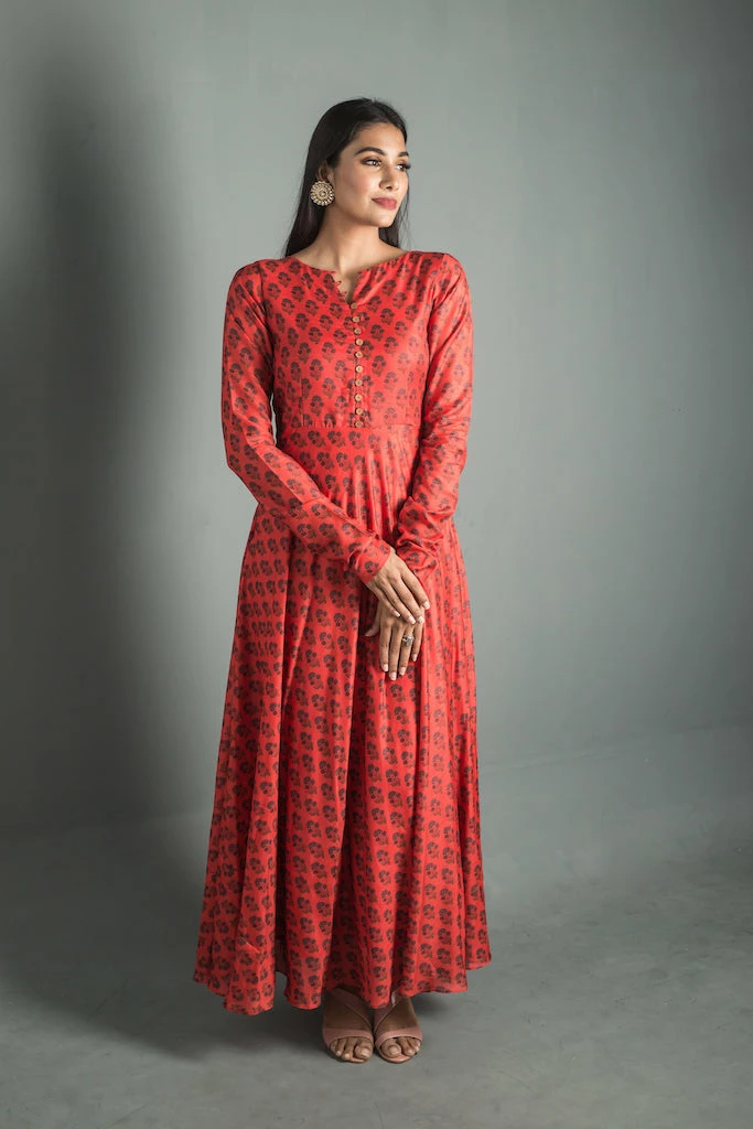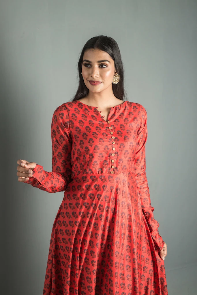 A look which is both ethnic and FASHIONABLE!!! This muslin silk long dress in bold colours and traditional prints is definitely to be adorned for graceful look. The closed round neck, crushed sleeves and shell buttons elevates the entire outfit.
