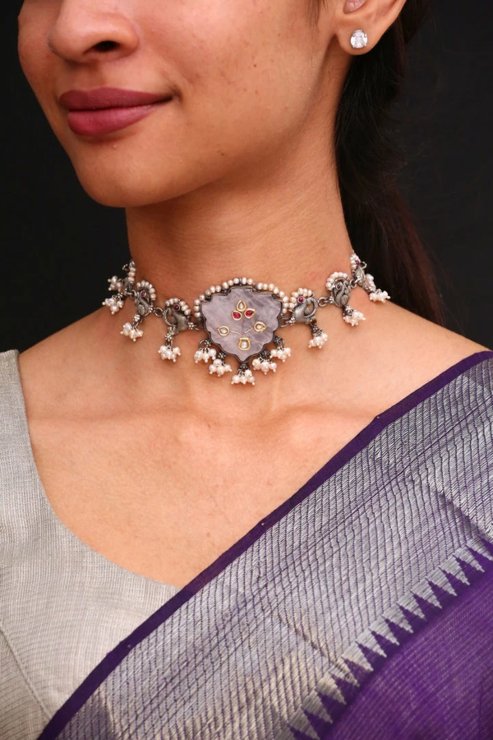 925 silver carving stone neckpiece that can go well with your traditional as well as indo- western outfits.