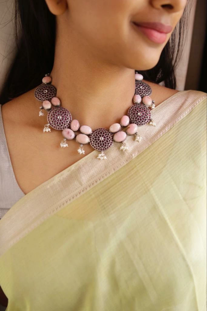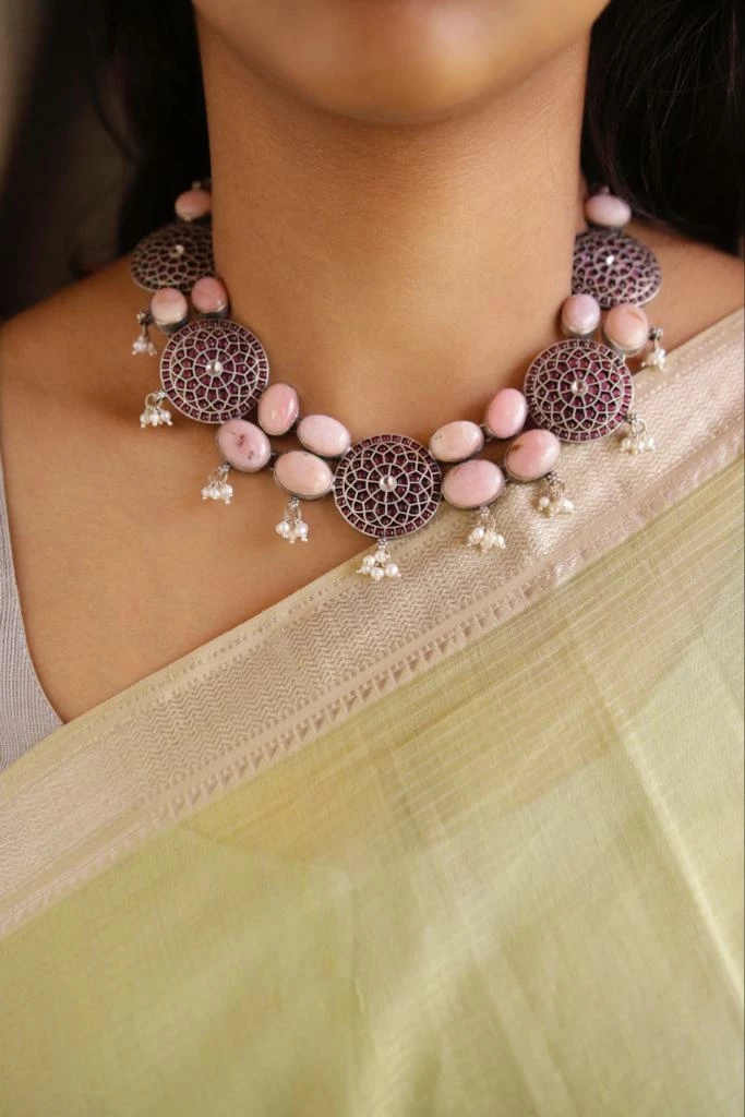 925 silver carving stone neckpiece that can go well with your traditional as well as indo- western outfits.Â
