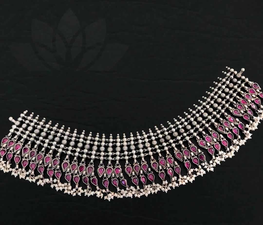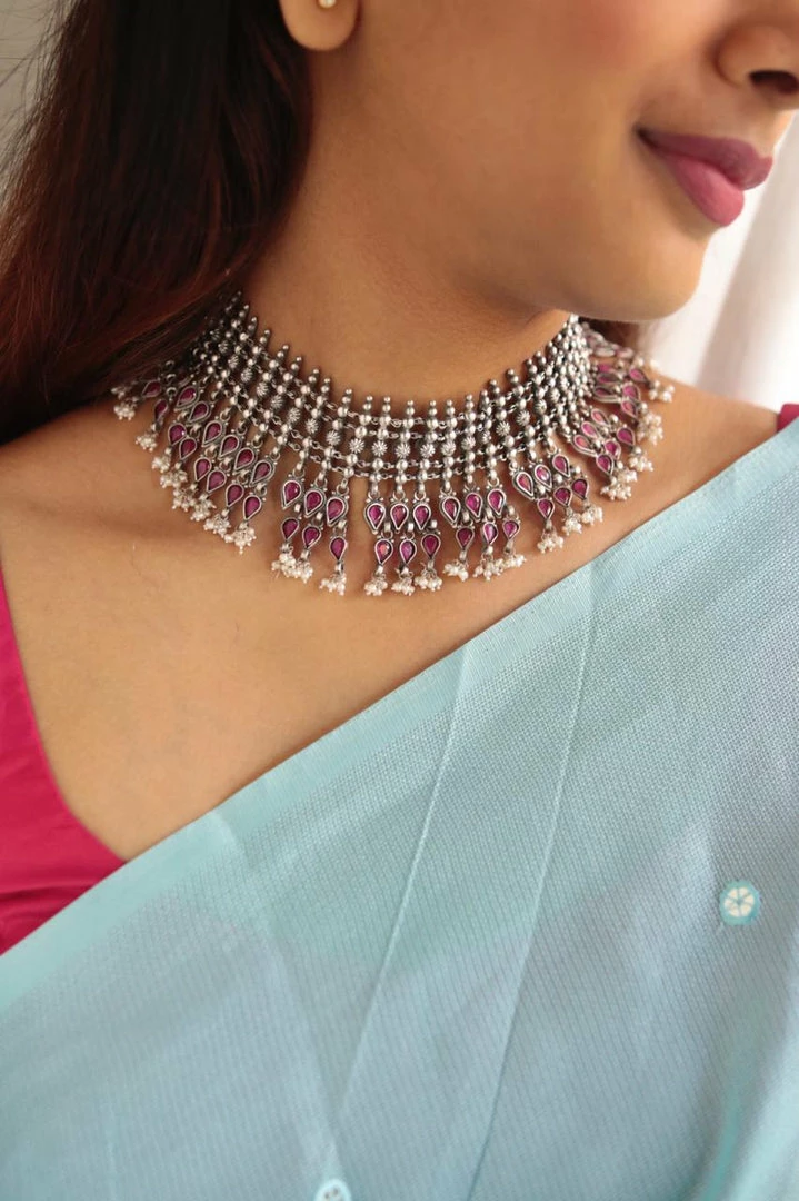 925 silver carving stone neckpiece that can go well with your traditional as well as indo- western outfits.Â