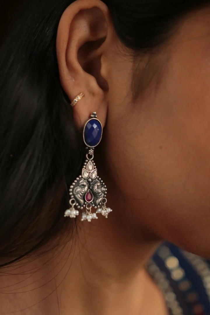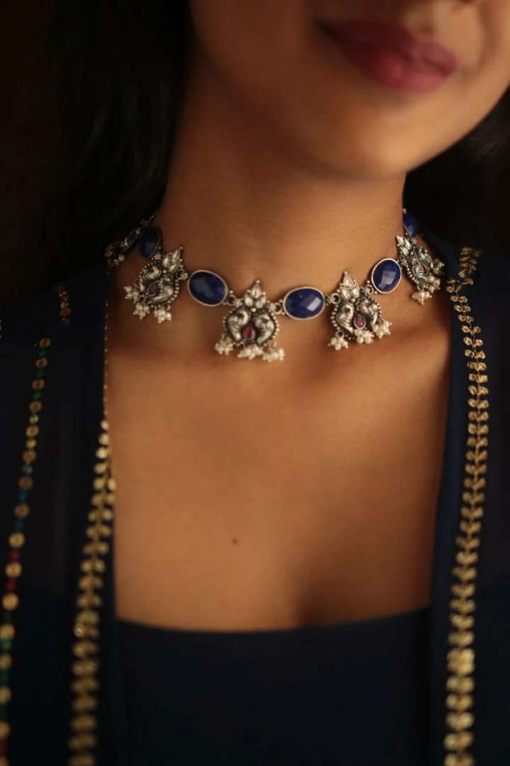 925 siver neckpiece that can go well with your traditional as well as indo- western outfits. Elegant Lapis stones. The dots found on these Lapis stones are random patterns which make it one of a kind and beautiful. Every lapis stone is so unique, same pattern can’t be found in another stone