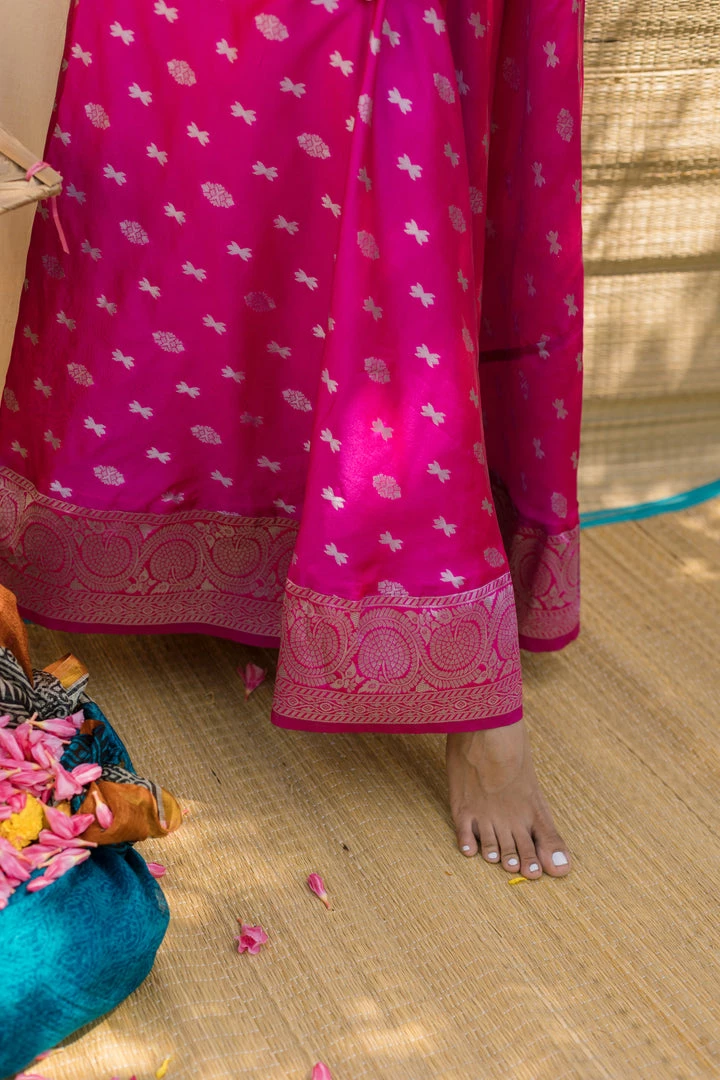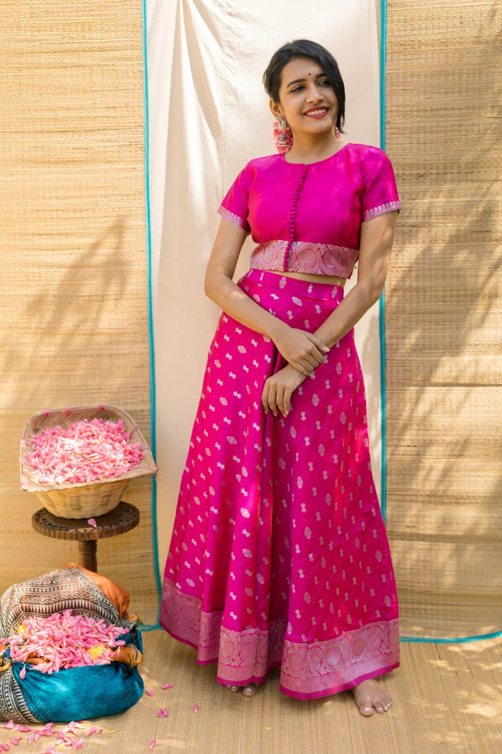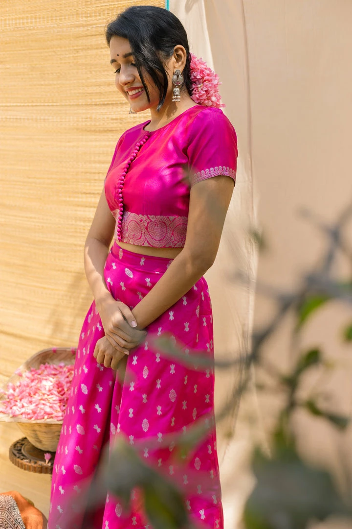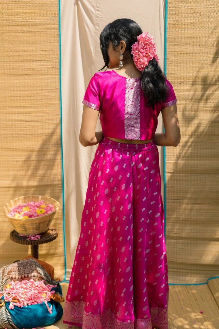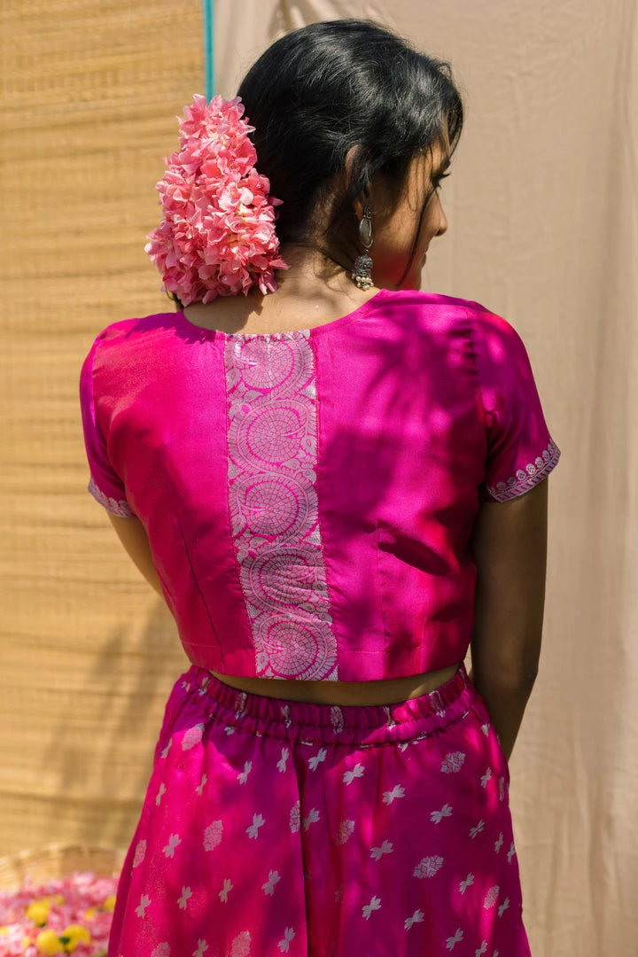 Pink and silver crop and skirt set with potli detailing and banarasi skirt .The skirt and top is fully lined.