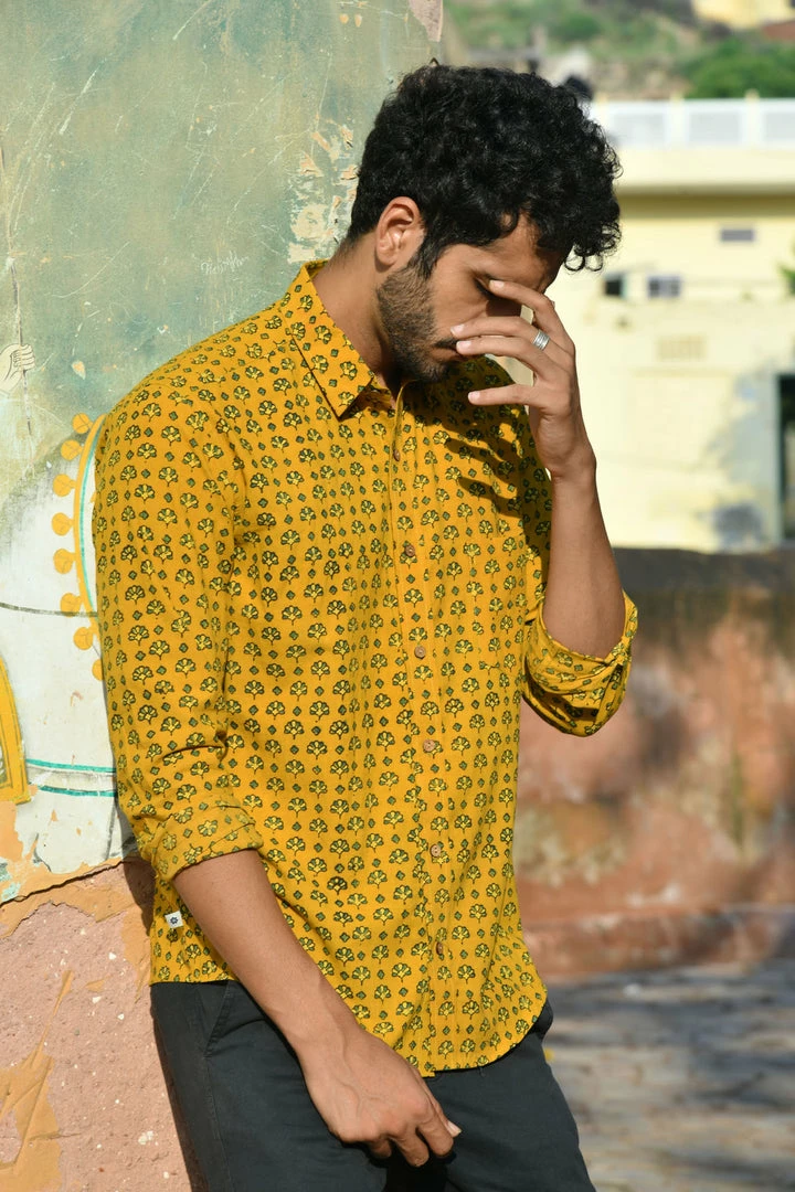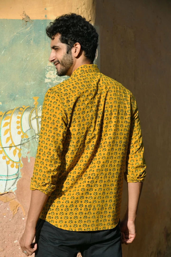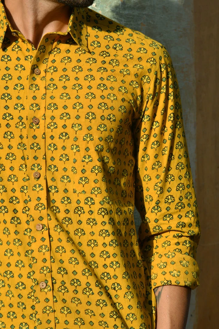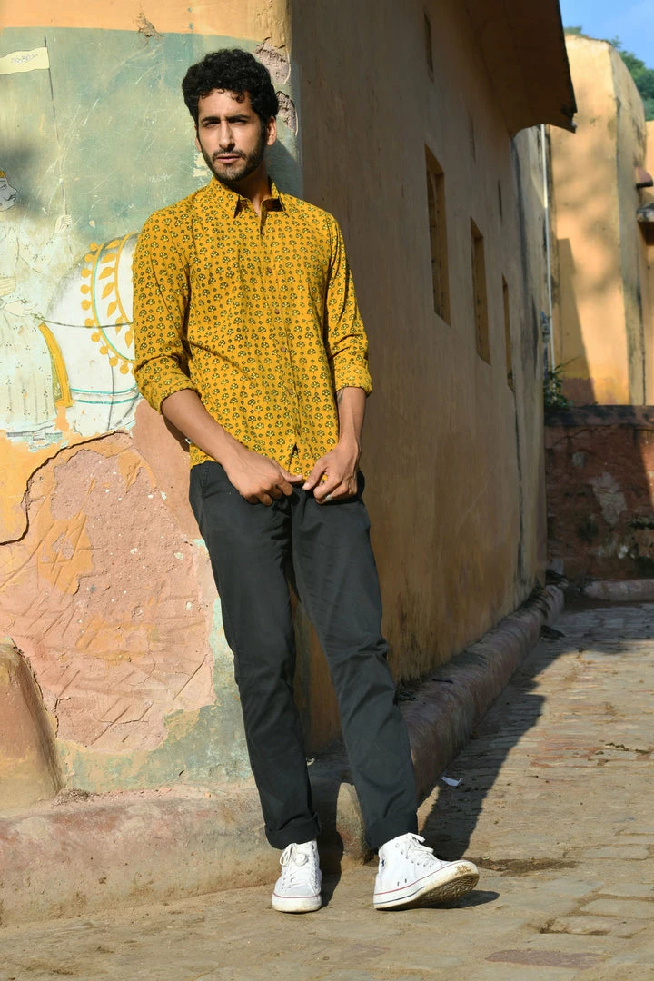 Look handsome and stay comfortable in this full-sleeved shirt featured with regular spread collar. Fashioned from cotton Ajrakhh fabric, this shirt comes with intricate prints all over.