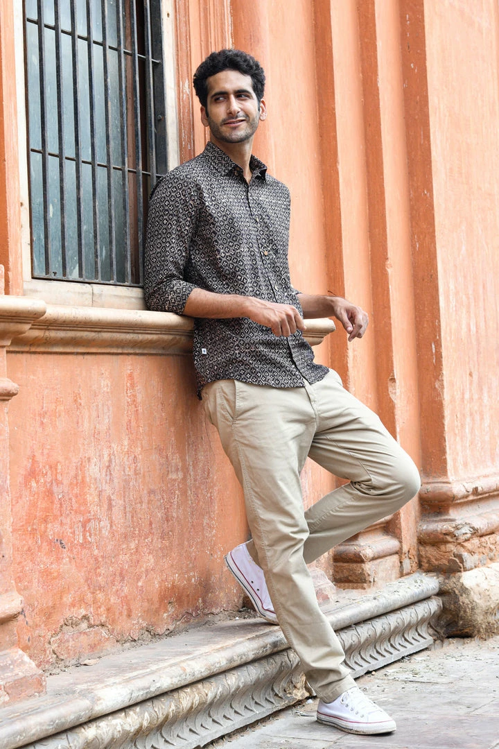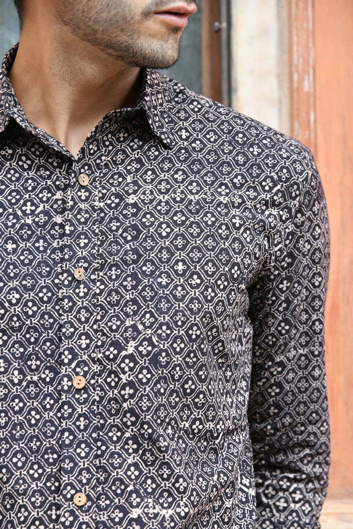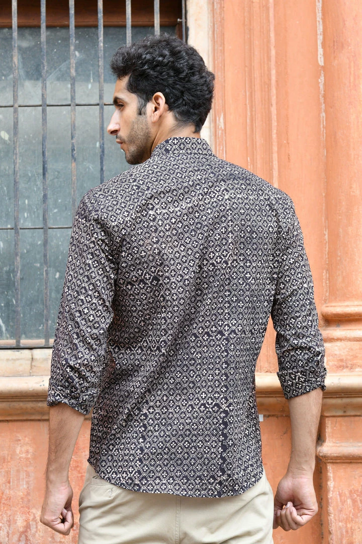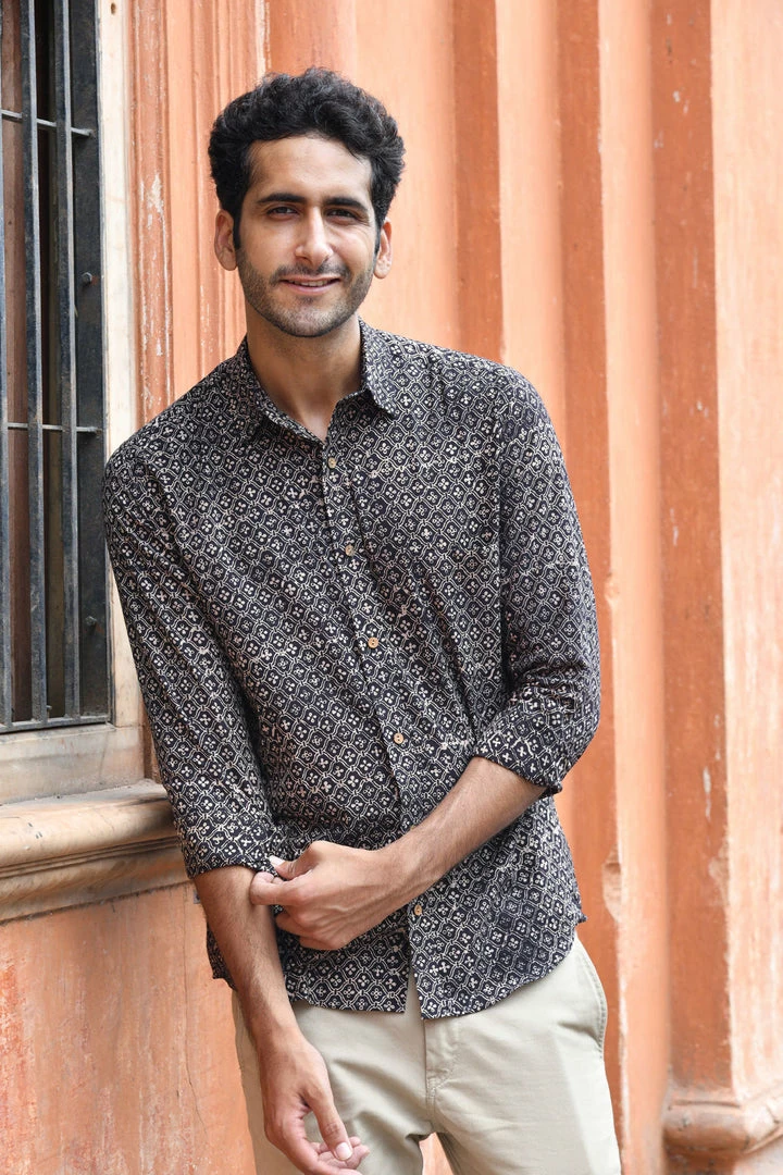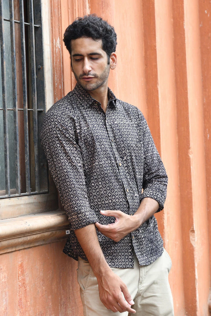 Look handsome and stay comfortable in this full-sleeved shirt featured with regular spread collar. Fashioned from cotton Ajrakhh fabric, this shirt comes with intricate prints all over.