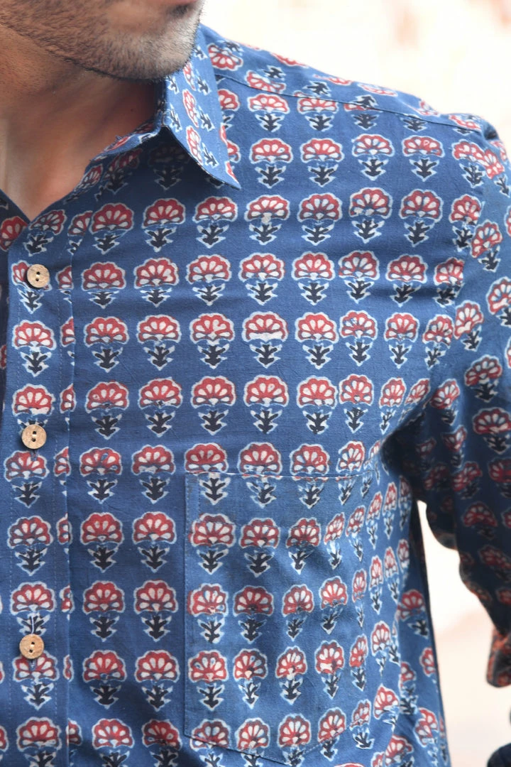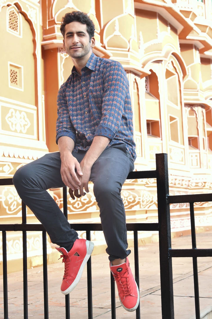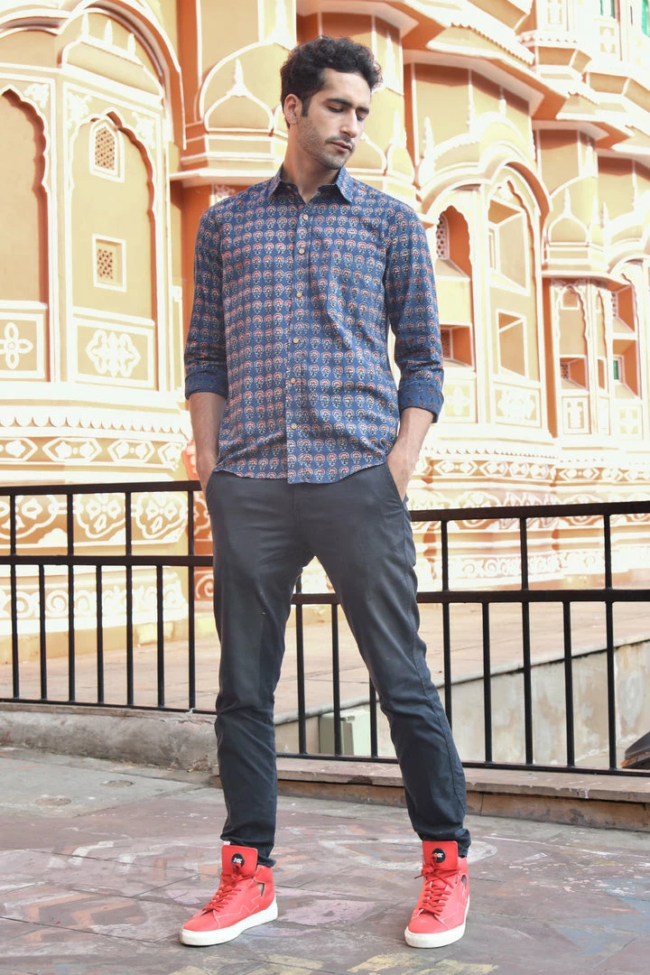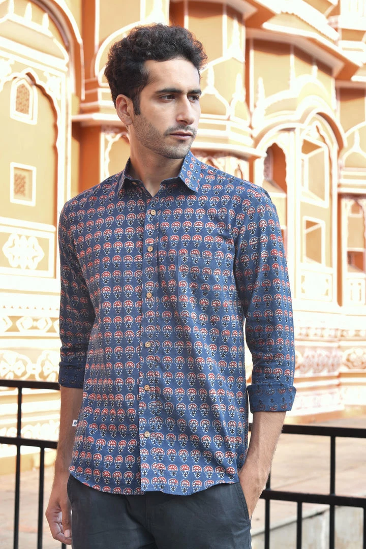Look handsome and stay comfortable in this full-sleeved shirt featured with regular spread collar. Fashioned from cotton Ajrakhh fabric, this shirt comes with intricate prints all over.