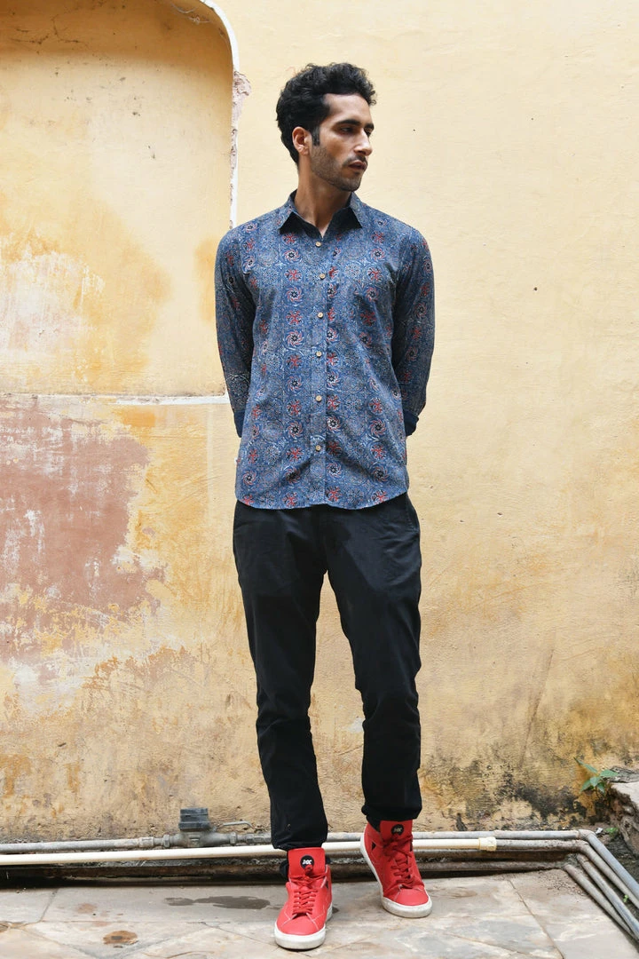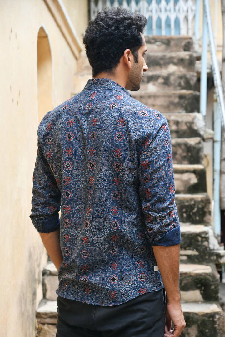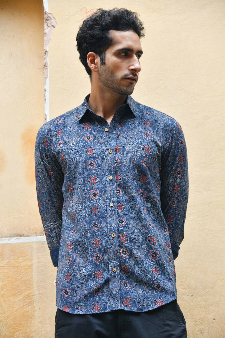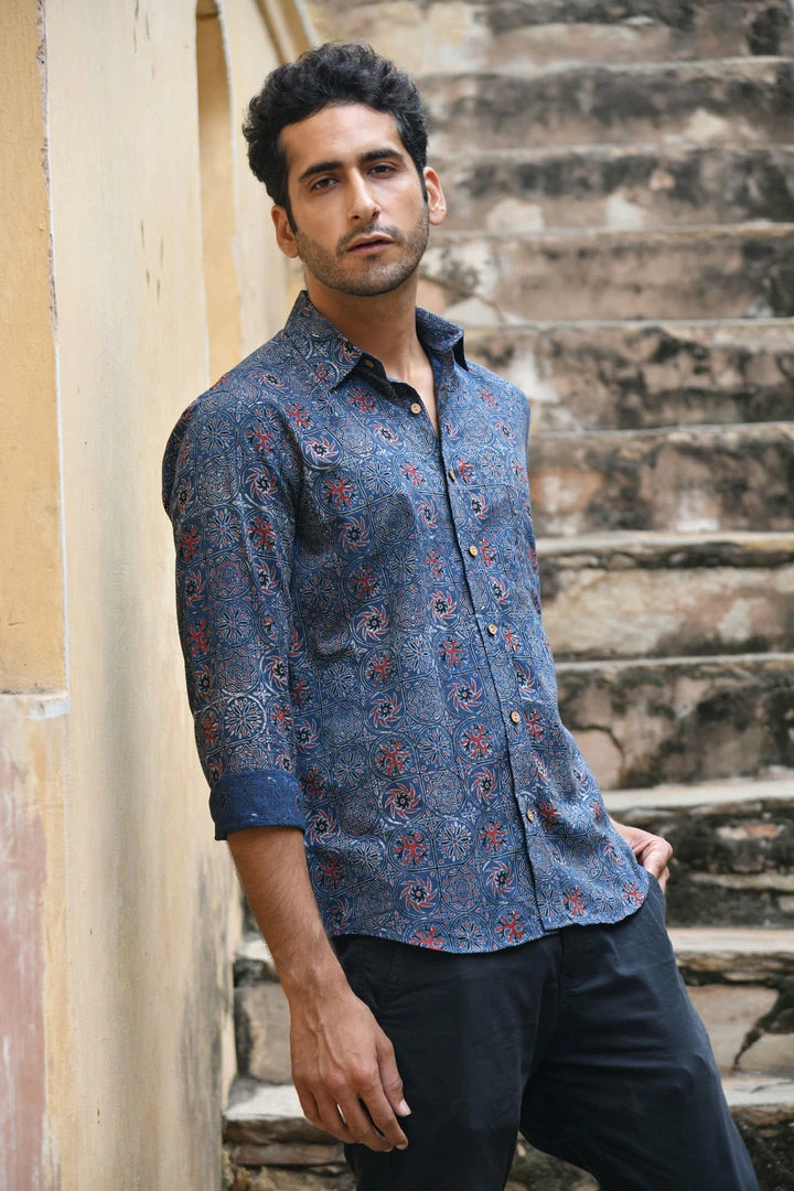 Look handsome and stay comfortable in this full-sleeved shirt featured with regular spread collar. Fashioned from cotton Ajrakhh fabric, this shirt comes with intricate prints all over.