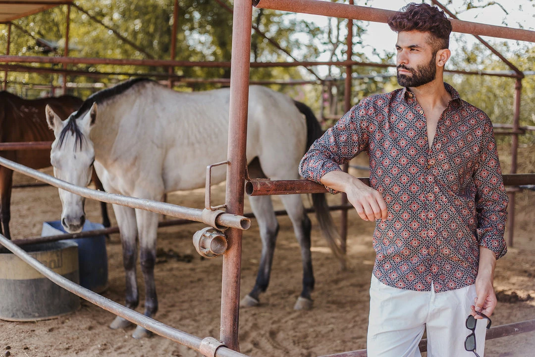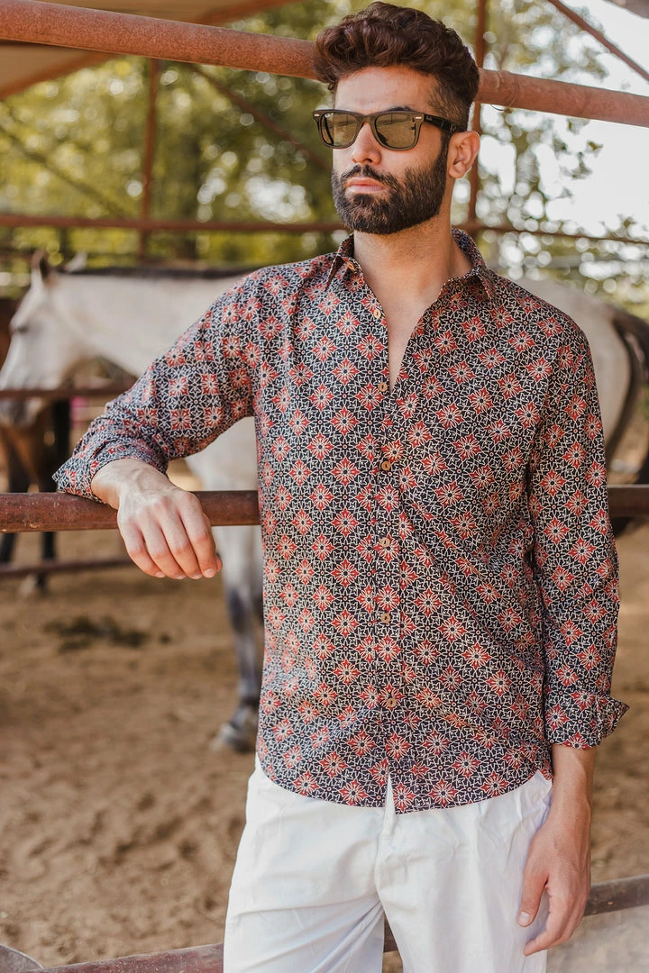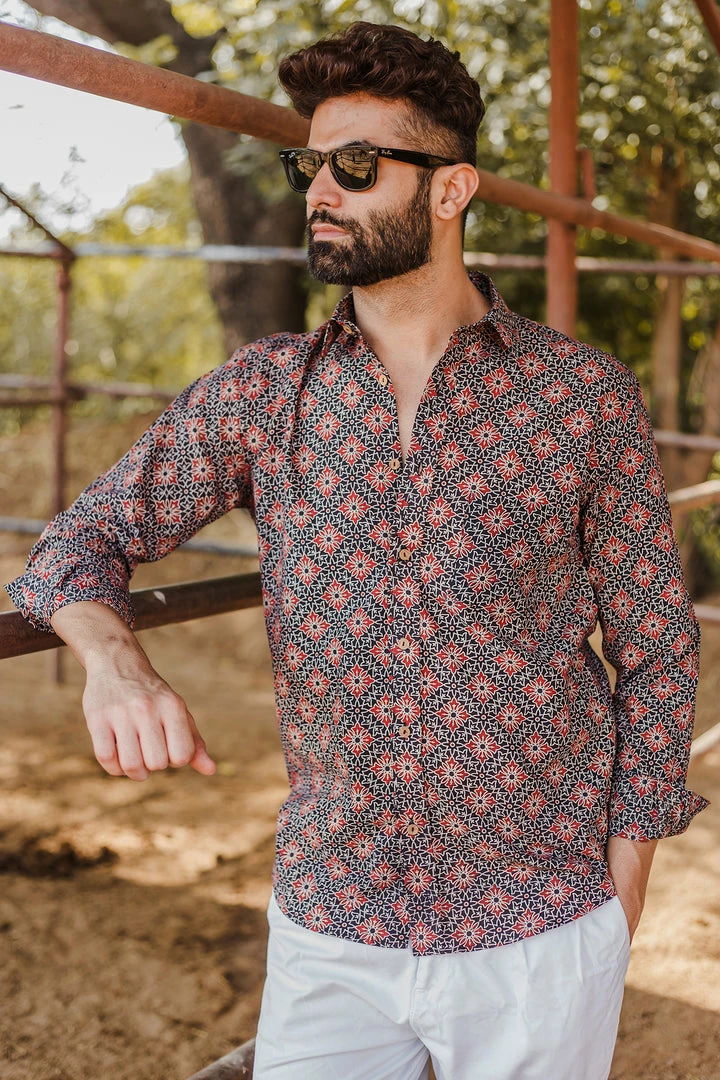 ook handsome and stay comfortable in this full-sleeved shirt featured with regular spread collar. Fashioned from cotton fabric, this shirt comes with intricate star print all over.