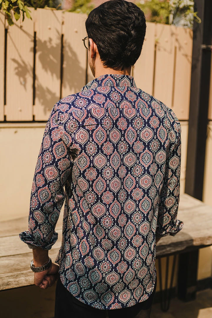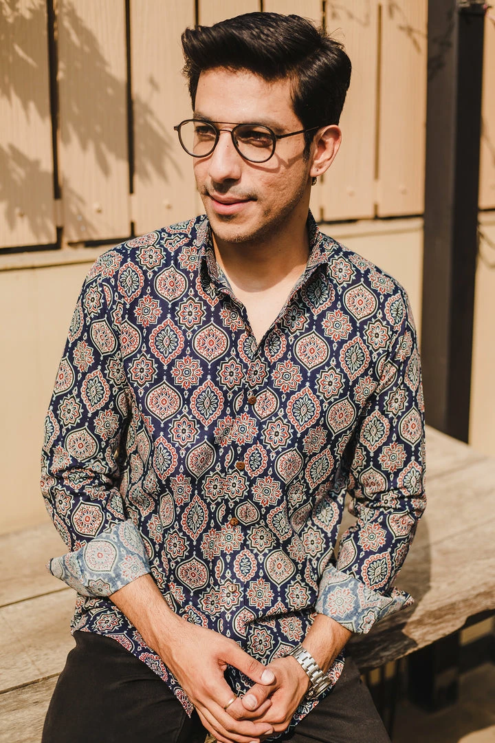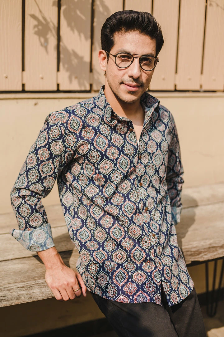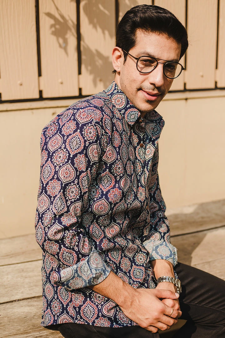 Look handsome and stay comfortable in this full-sleeved shirt featured with regular spread collar. Fashioned from cotton fabric, this shirt comes with intricate ajrakh persian print all over.