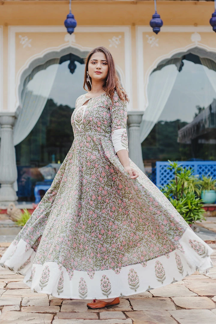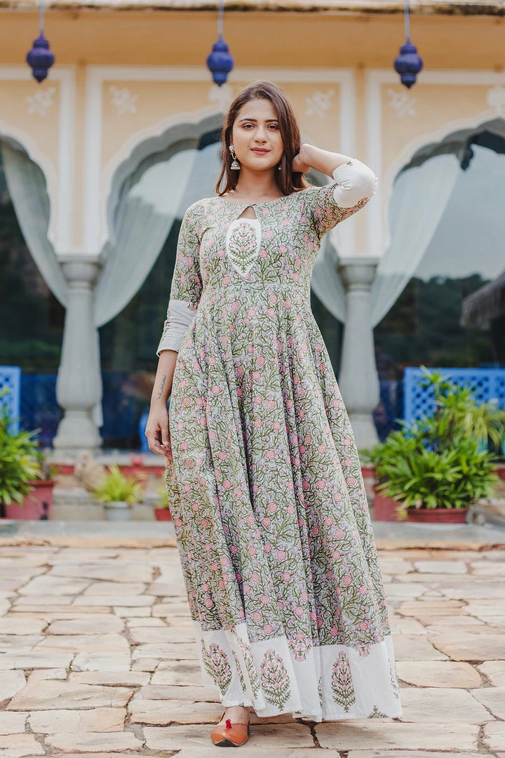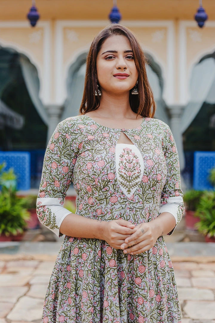 Fit and flare ensemble in soft cotton fabric with intricate floral print detailing on neck and flare.