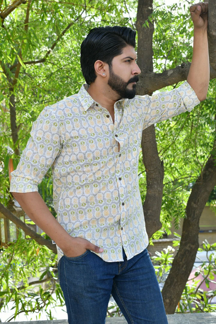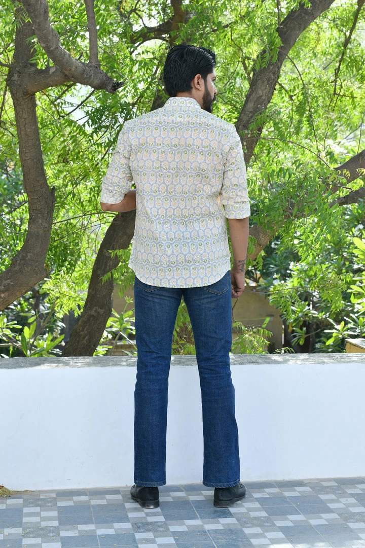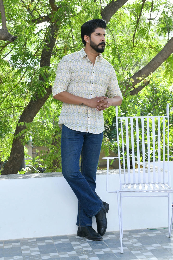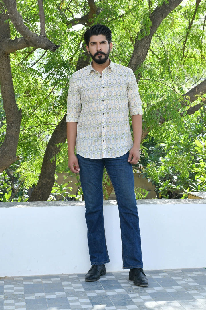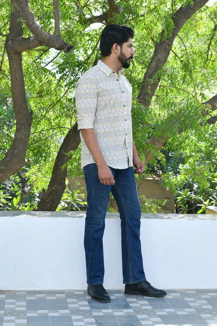 Look handsome and stay comfortable in this full-sleeved shirt featured with regular spread collar. Fashioned from cotton fabric, this shirt comes with intricate buti print all over.