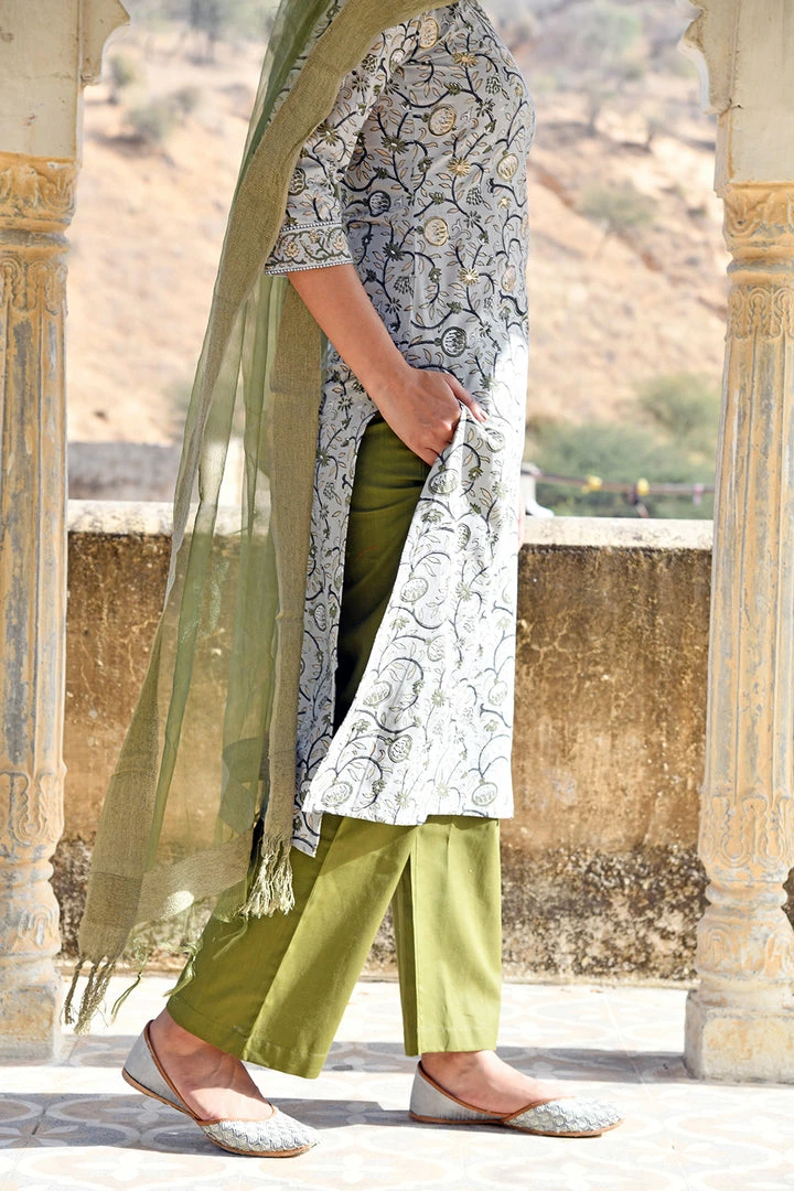 Made in grey and green, this kurta plazo set is perfect pick for your daily-go outfit to office wear, homewear, or a casual day outing. This set is Handblock printed with intricate mughal print in all the lovely colors.