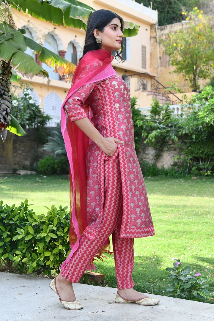 Made in magenta red colors , this kurta plazo set is perfect pick for your daily-go outfit to office wear, homewear, or a casual day outing. This set is Handblock printed with intricate neck work detailing in all the lovely colors.