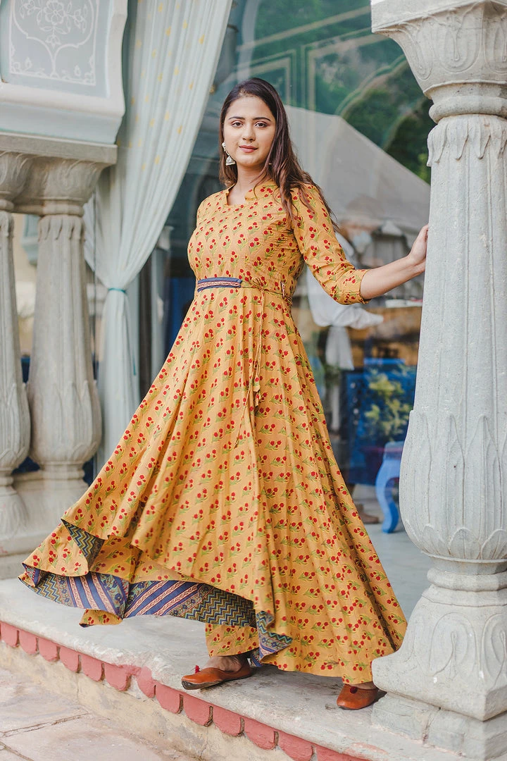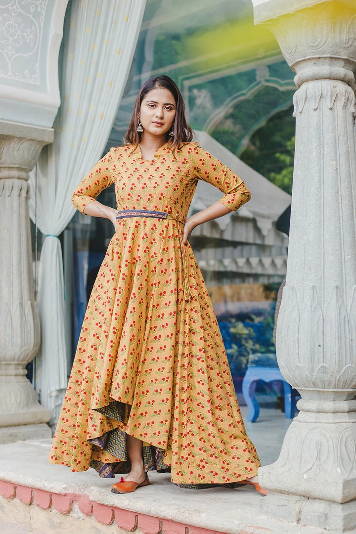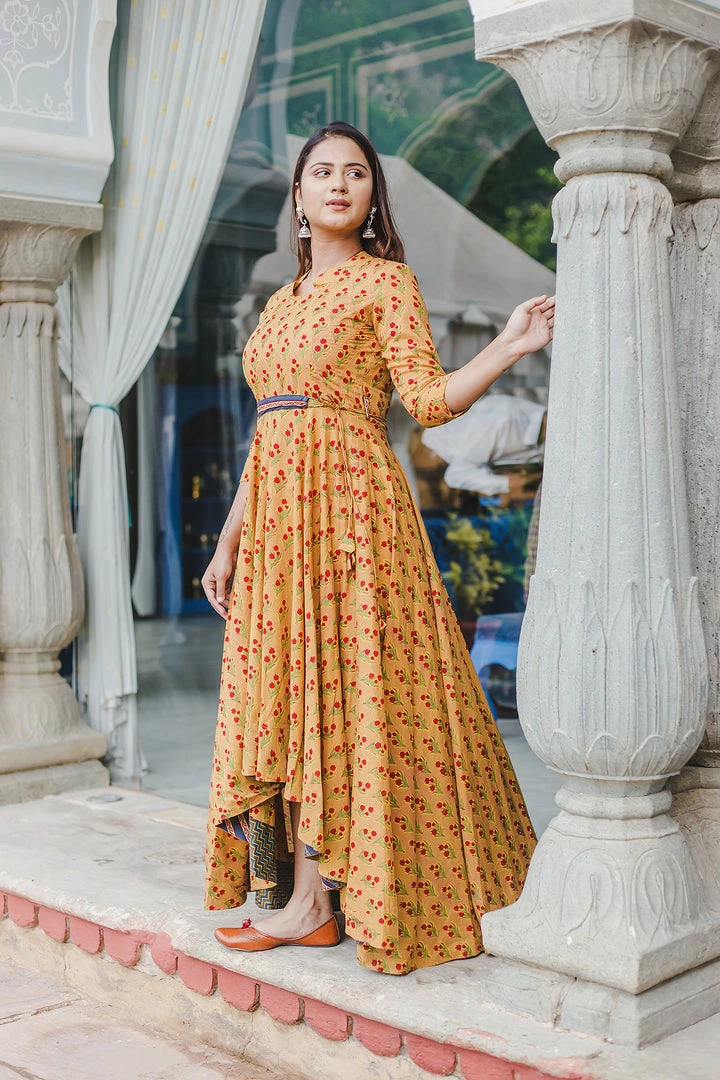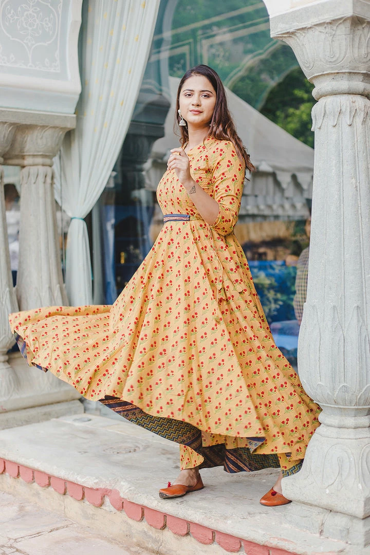 Fit and flare ensemble in hand block prints on soft cotton fabric with intricate red buti print detailing on neck and flare. Belt included