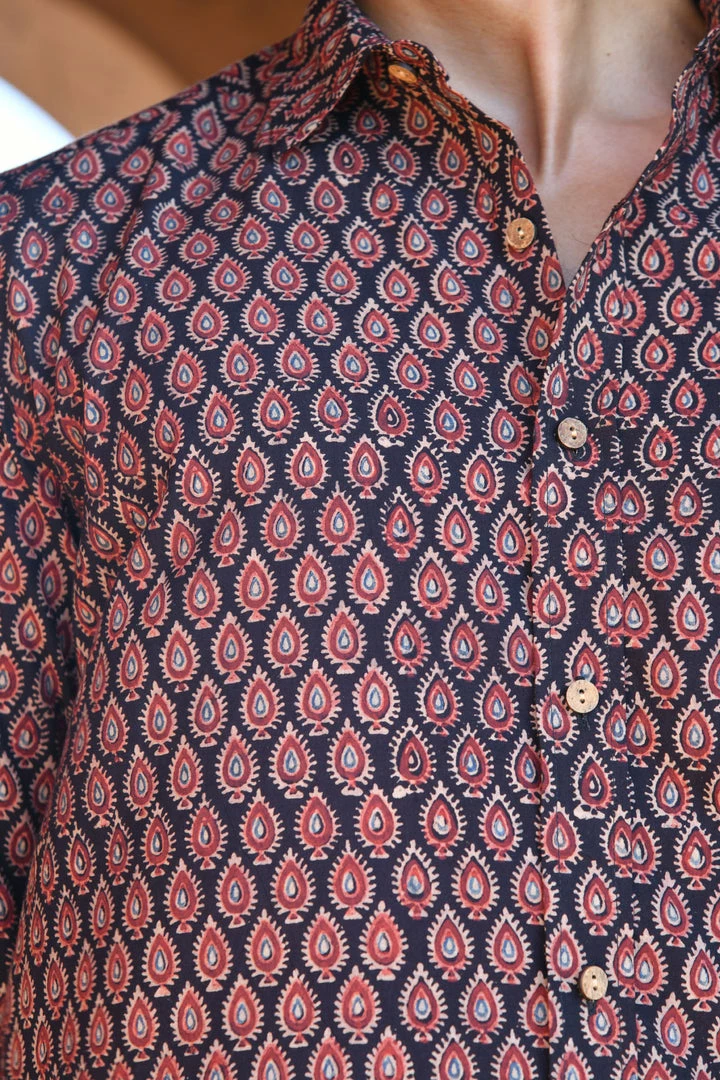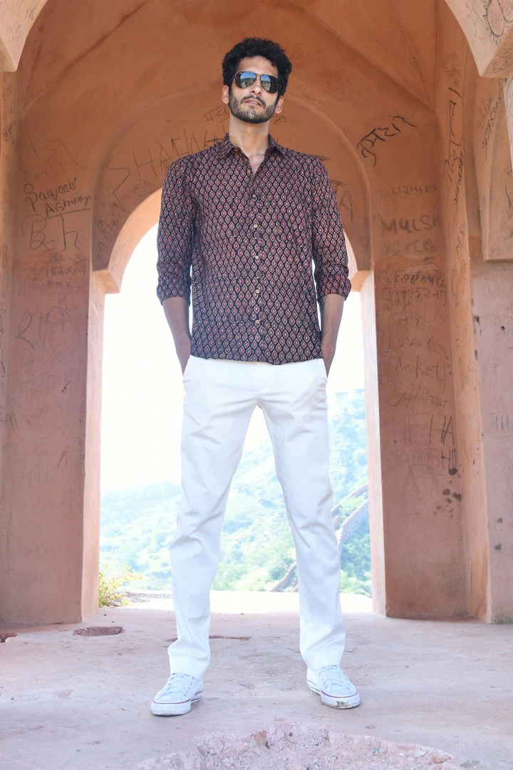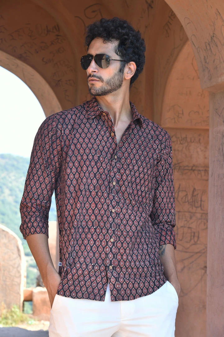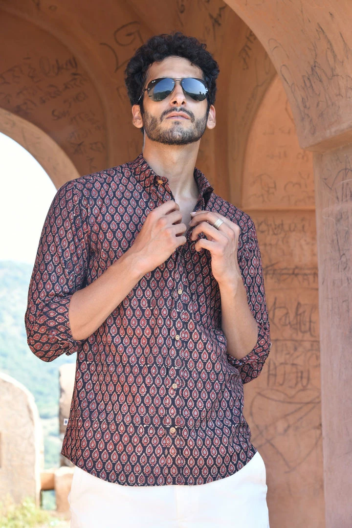 Look handsome and stay comfortable in this full-sleeved shirt featured with regular spread collar. Fashioned from cotton Ajrakhh fabric, this shirt comes with intricate prints all over.
