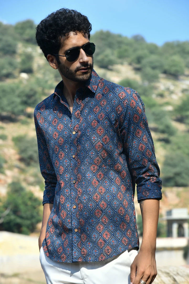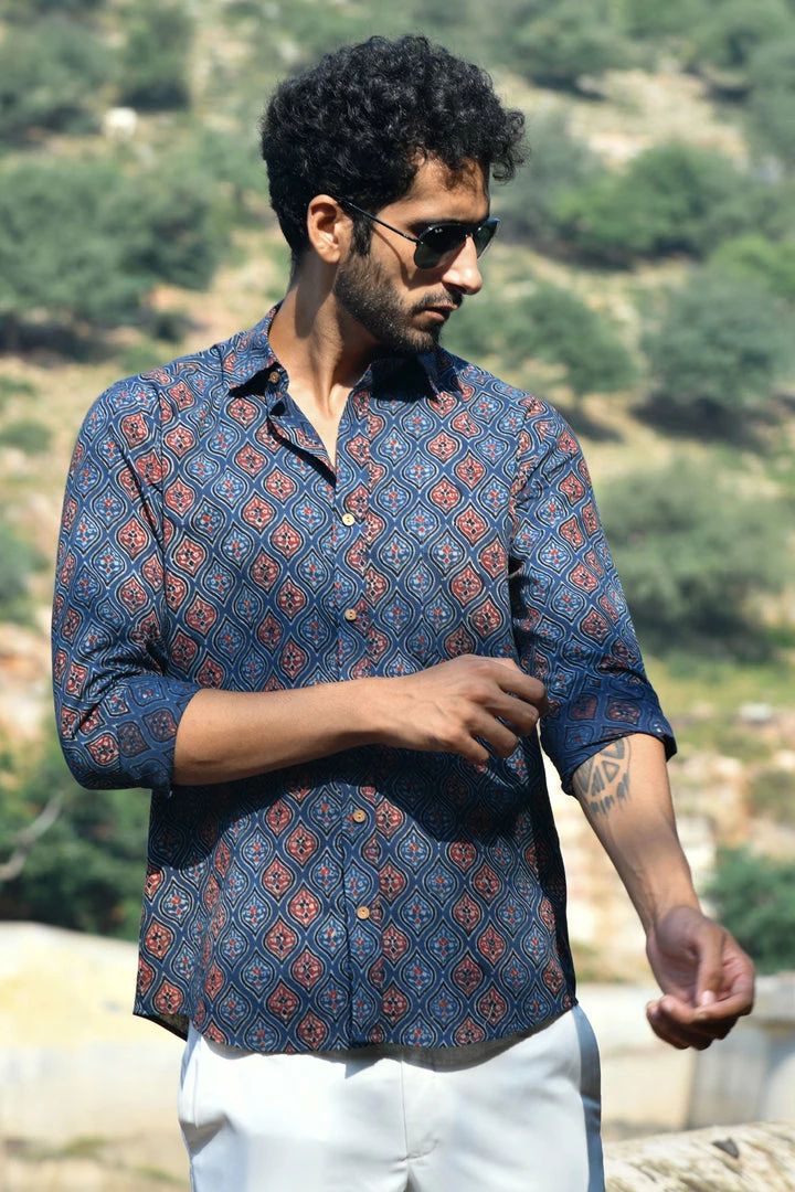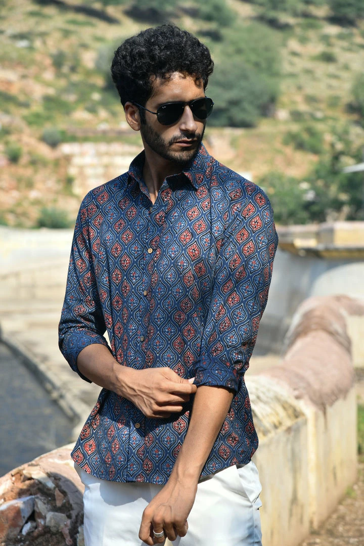 Look handsome and stay comfortable in this full-sleeved shirt featured with regular spread collar. Fashioned from cotton Ajrakhh fabric, this shirt comes with intricate prints all over.