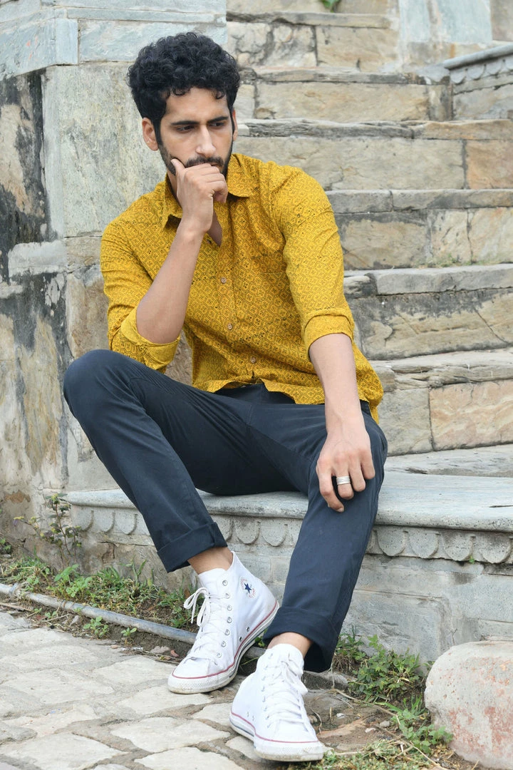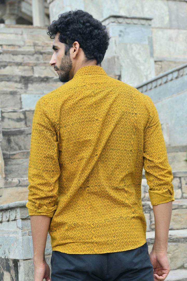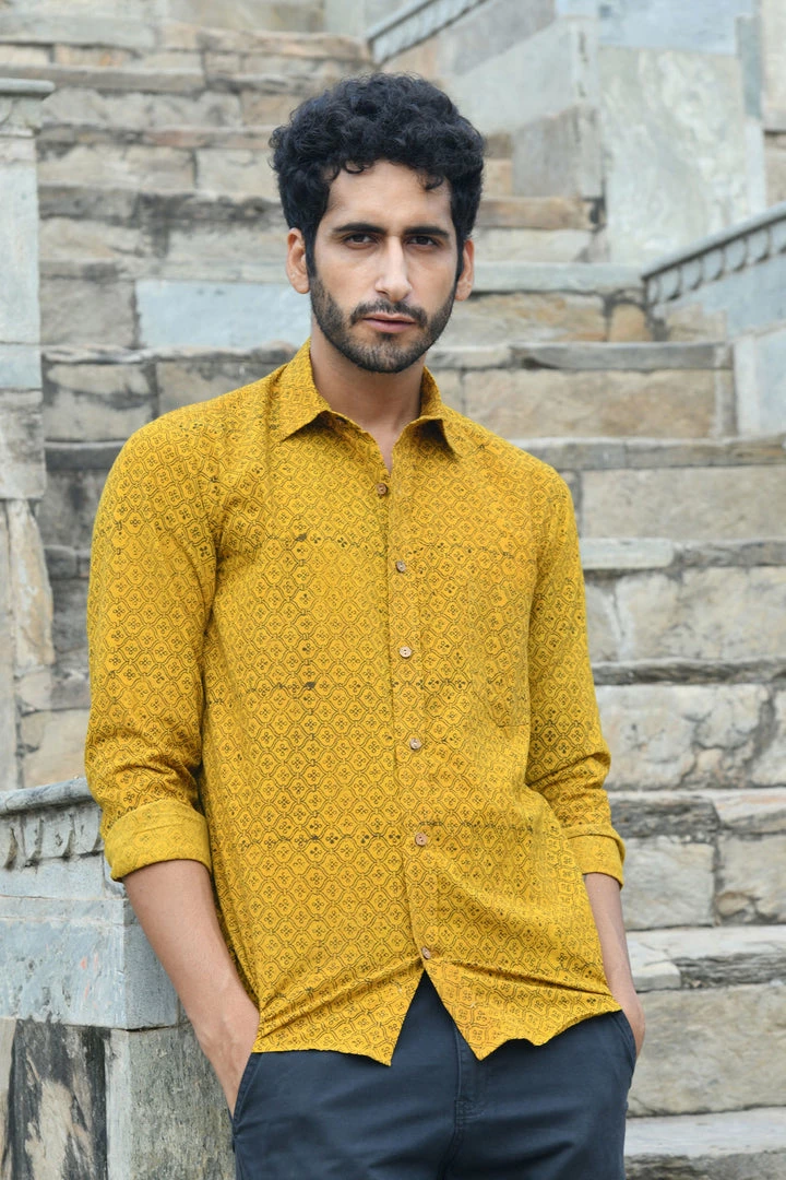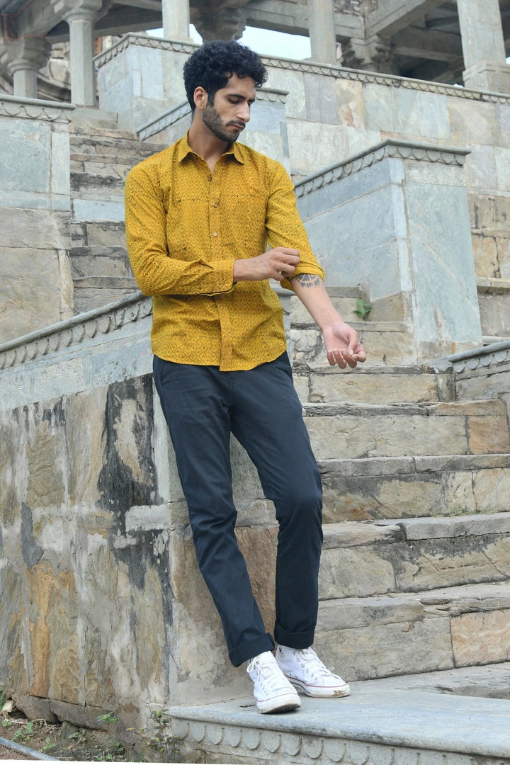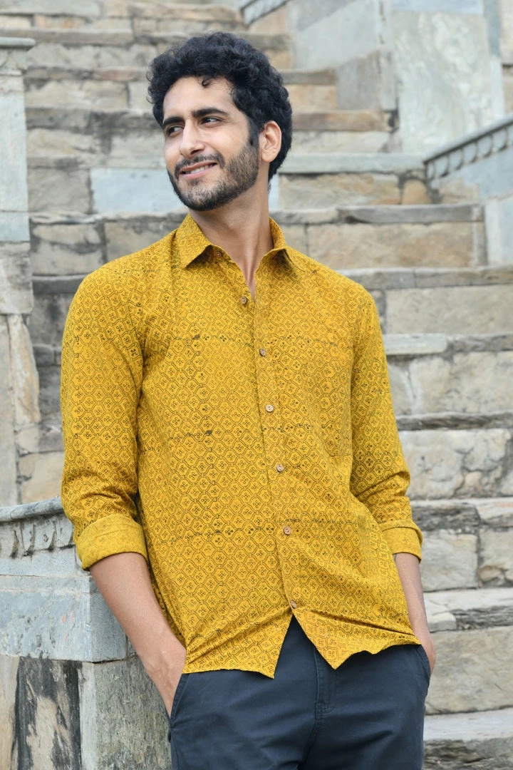 Look handsome and stay comfortable in this full-sleeved shirt featured with regular spread collar. Fashioned from cotton Ajrakhh fabric, this shirt comes with intricate prints all over.