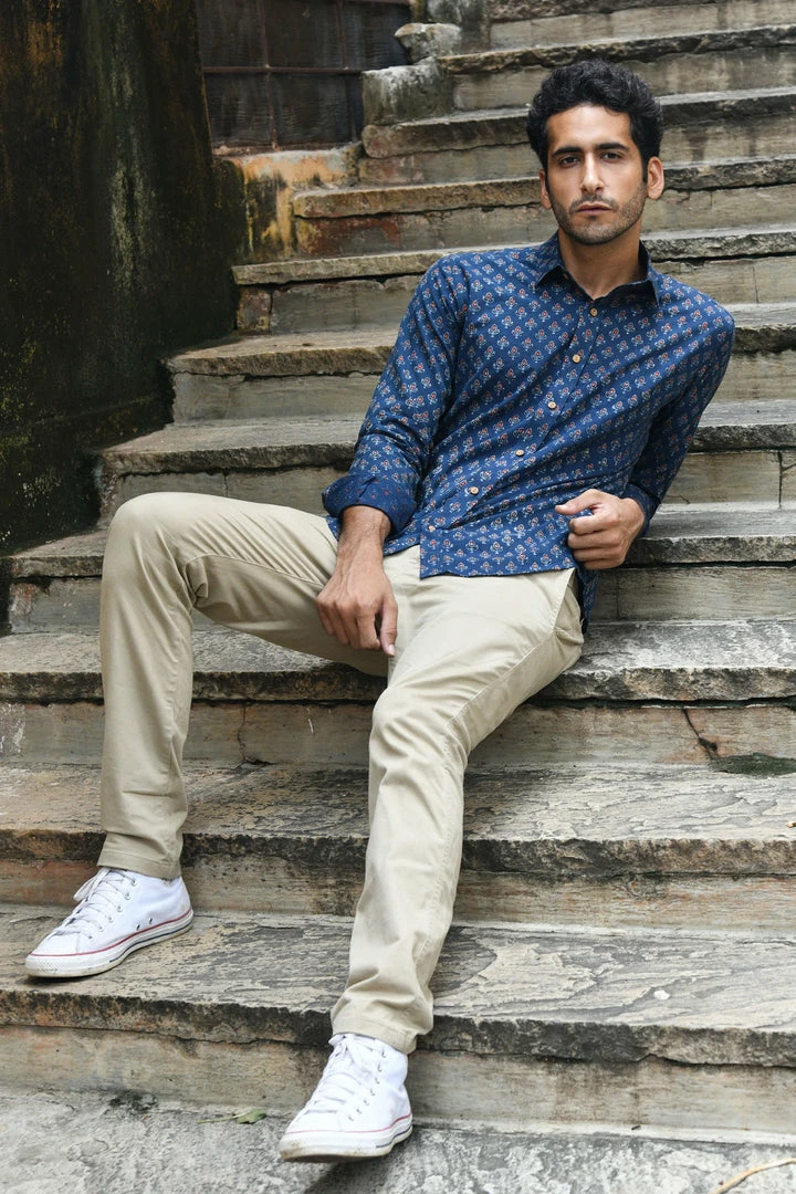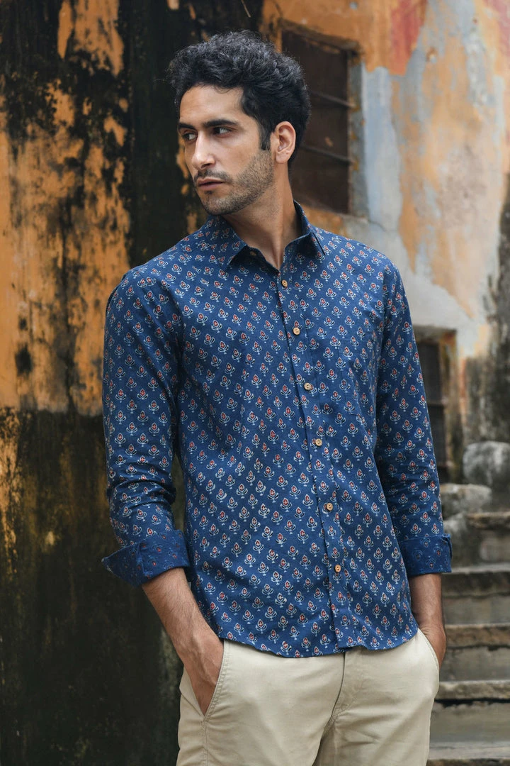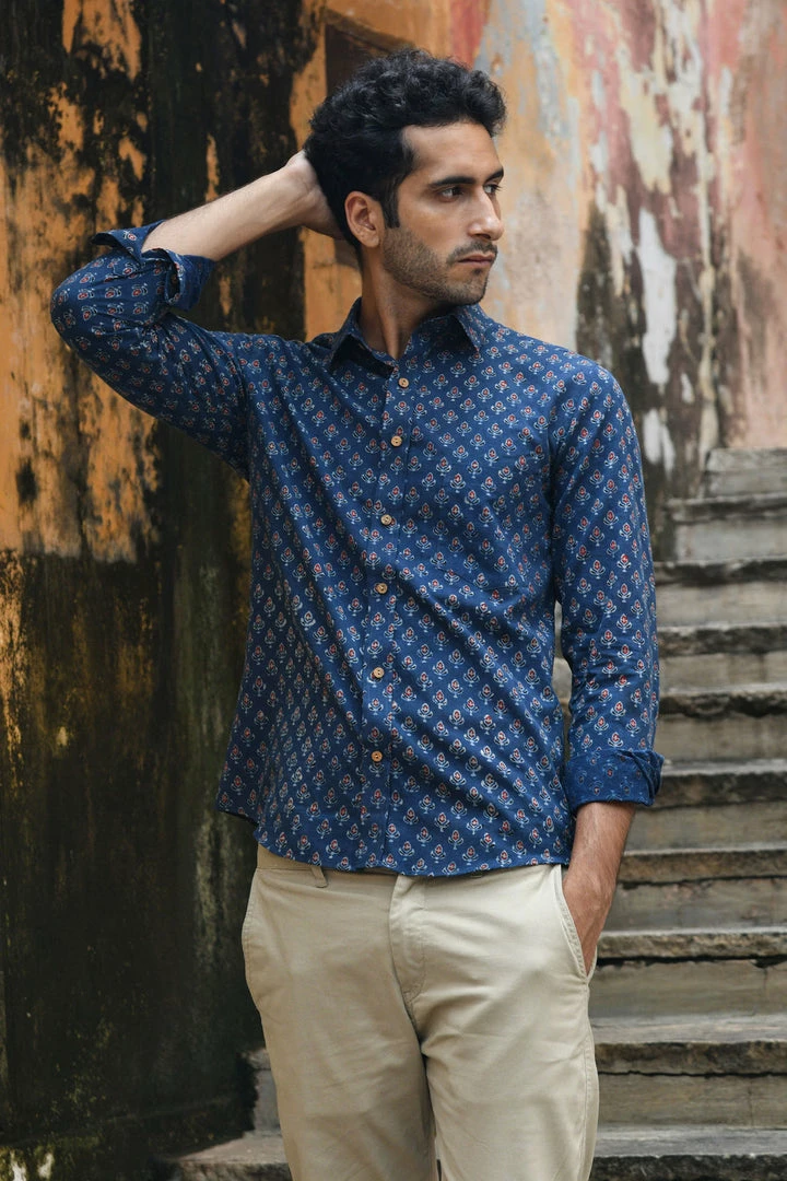 Look handsome and stay comfortable in this full-sleeved shirt featured with regular spread collar. Fashioned from cotton Ajrakhh fabric, this shirt comes with intricate prints all over.