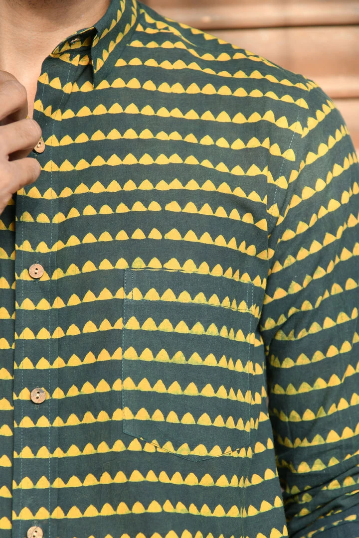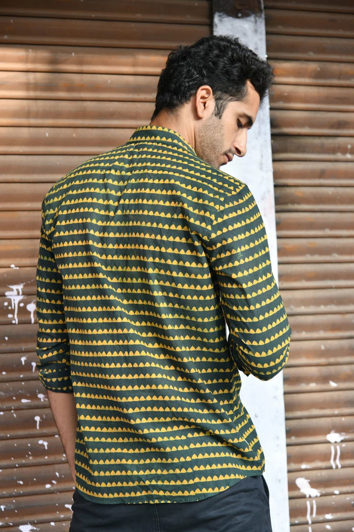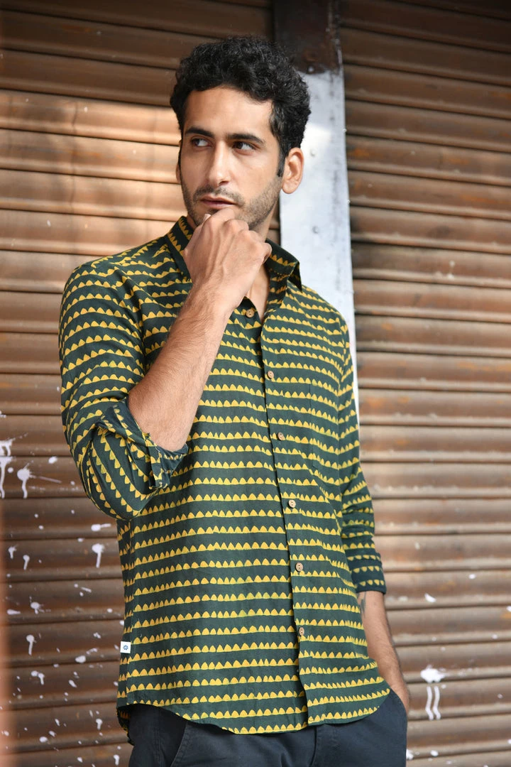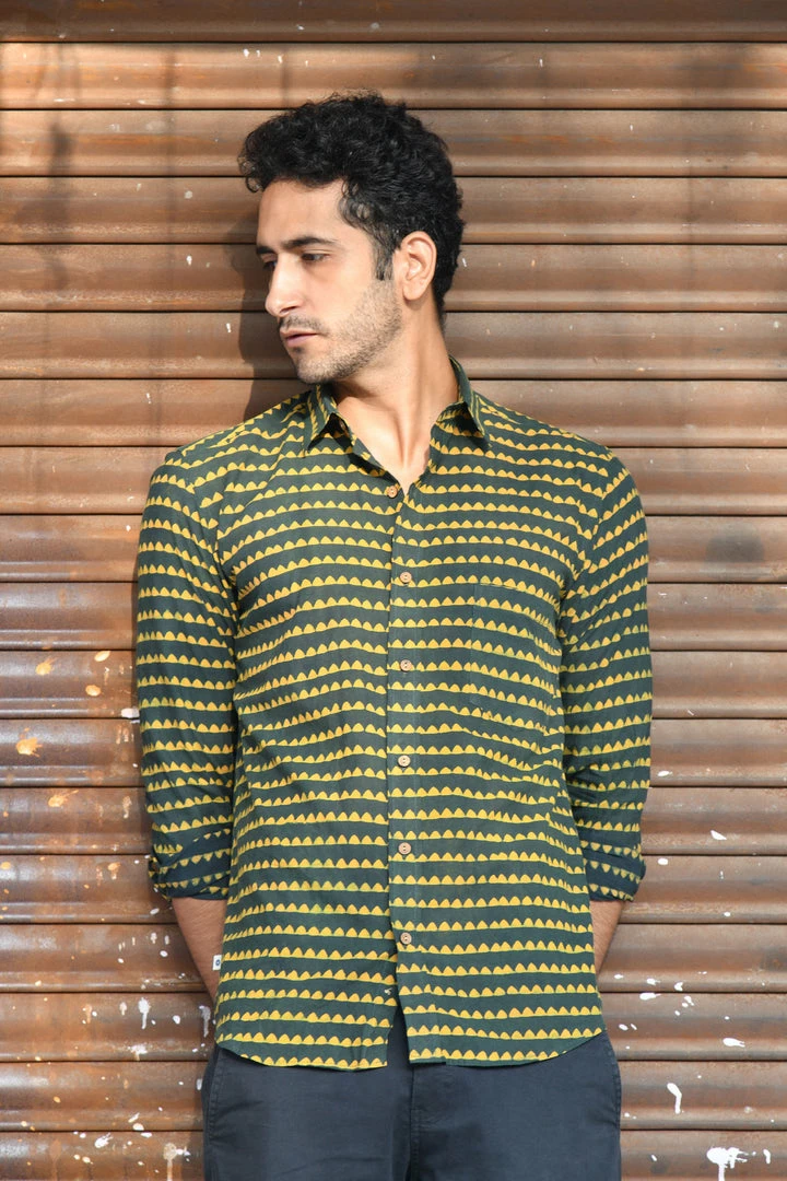 Look handsome and stay comfortable in this full-sleeved shirt featured with regular spread collar. Fashioned from cotton Ajrakhh fabric, this shirt comes with intricate prints all over.