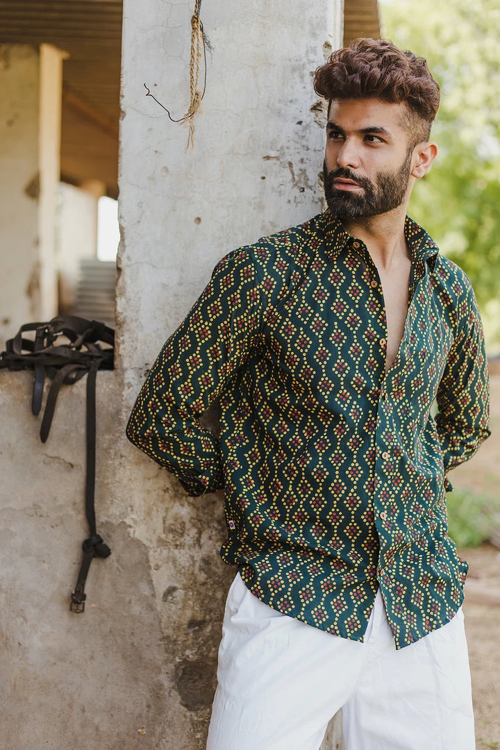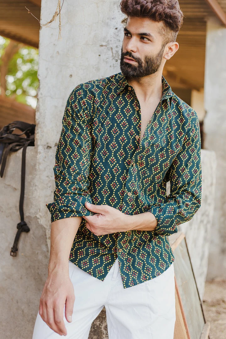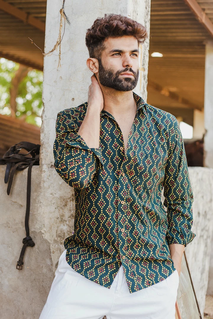 Look handsome and stay comfortable in this full-sleeved shirt featured with regular spread collar. Fashioned from cotton fabric, this shirt comes with intricate bandhej print all over.