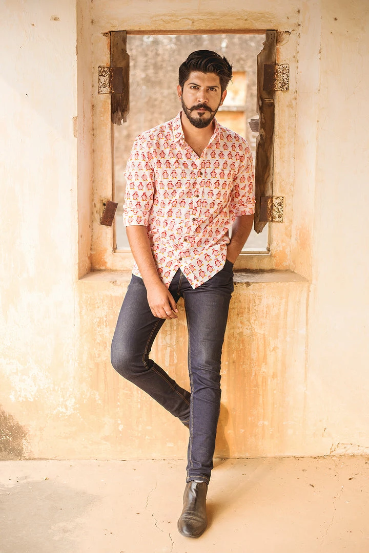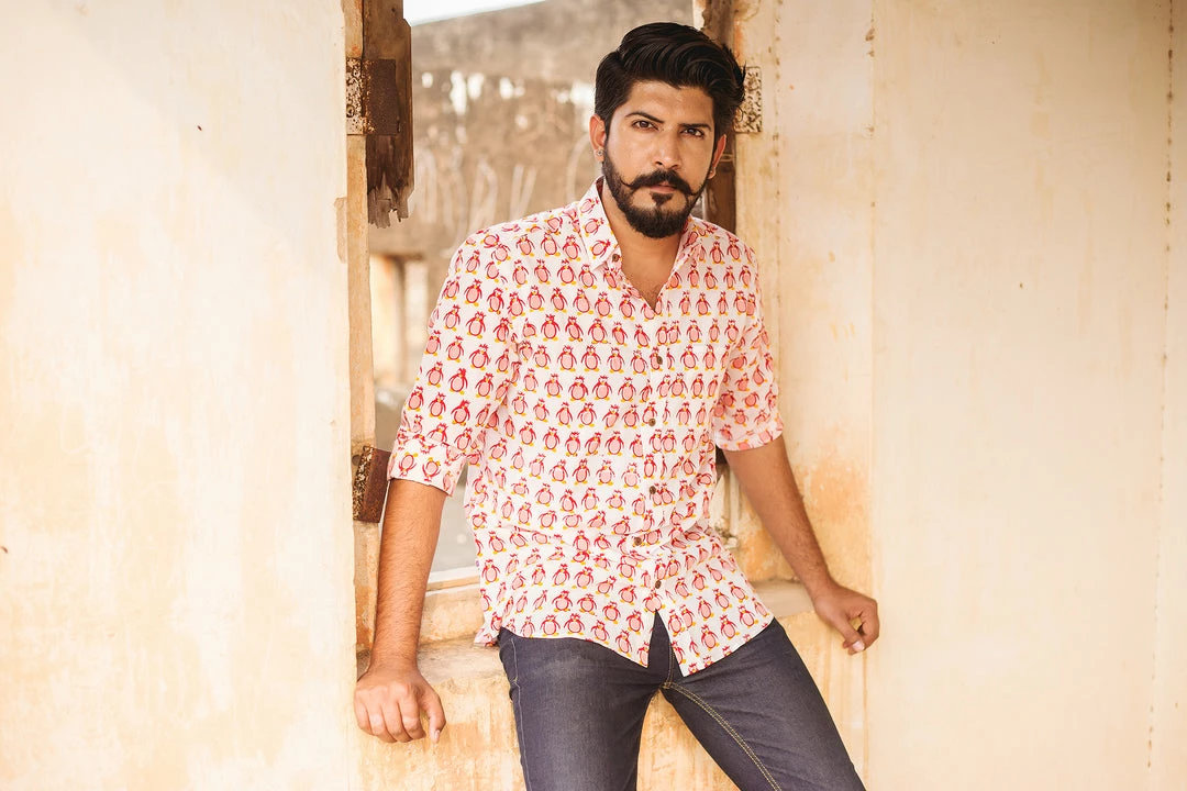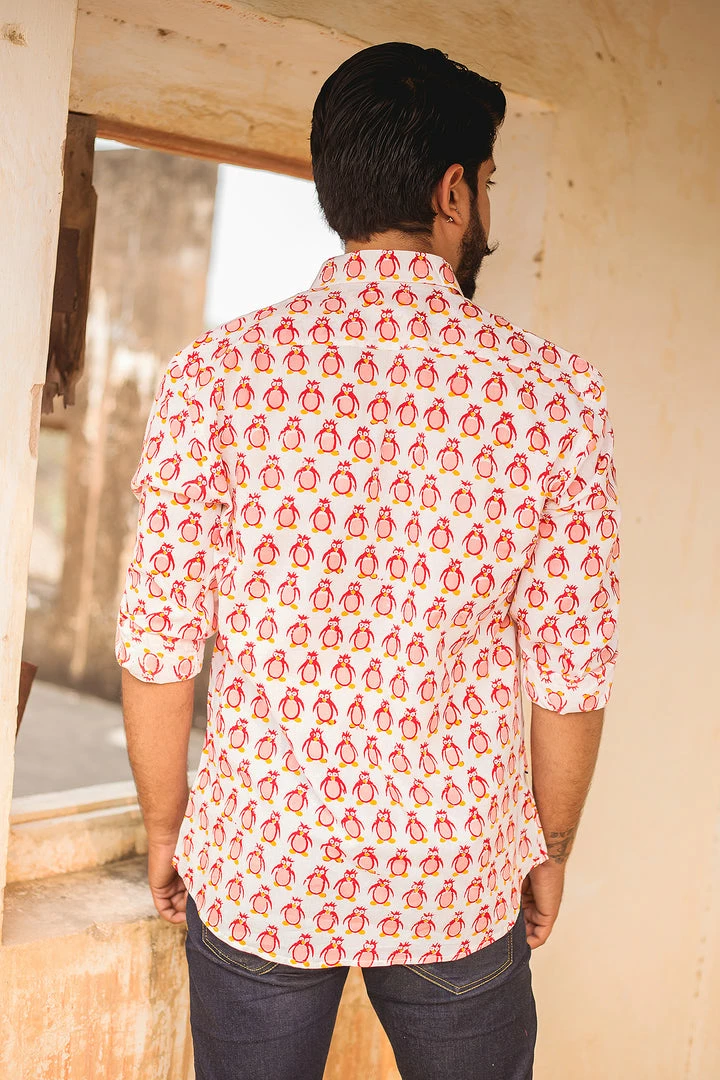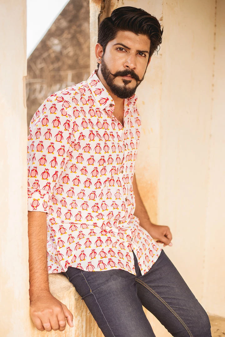 Look handsome and stay comfortable in this full-sleeved shirt featured with regular spread collar. Fashioned from cotton fabric, this shirt comes with intricate penguin print all over.
