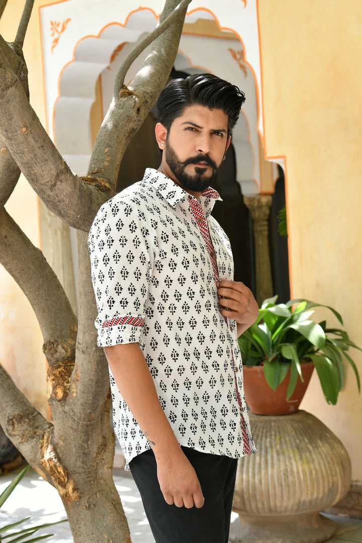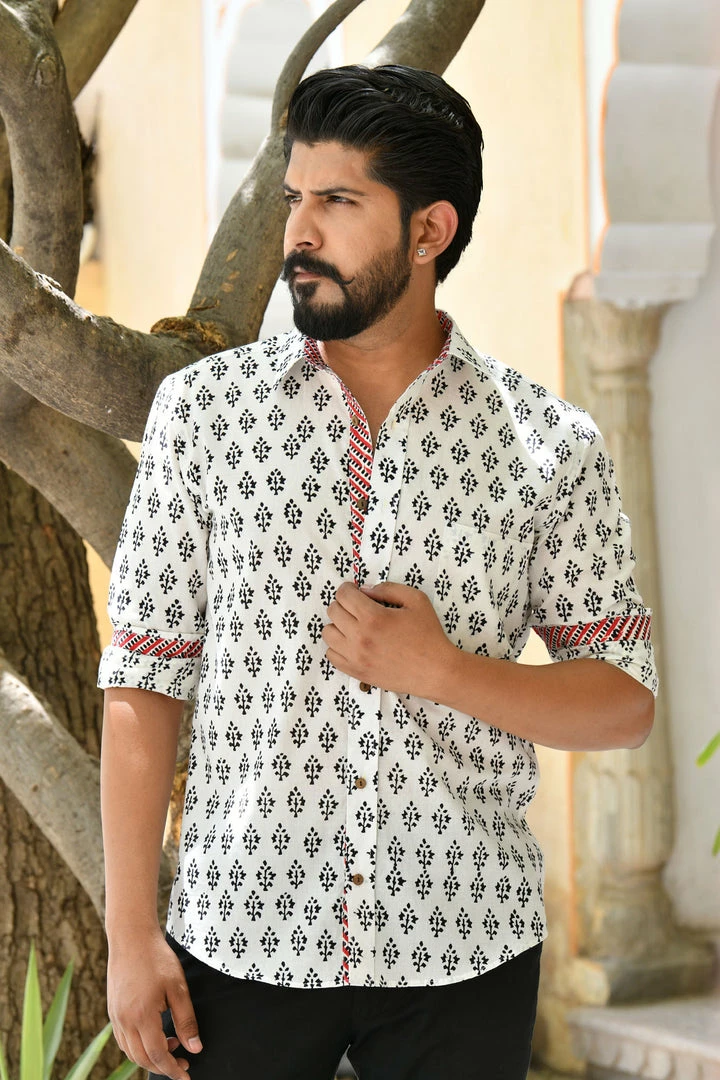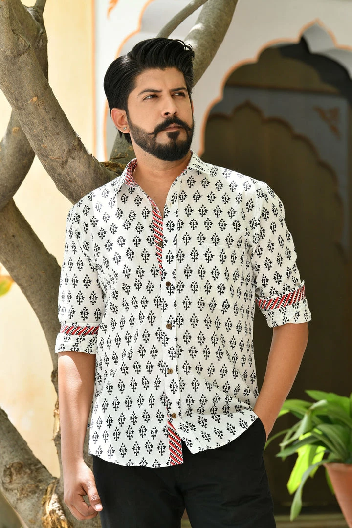Look handsome and stay comfortable in this full-sleeved shirt featured with regular spread collar. Fashioned from cotton fabric, this shirt comes with intricate buti print all over.