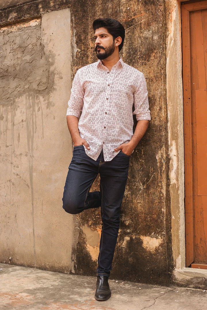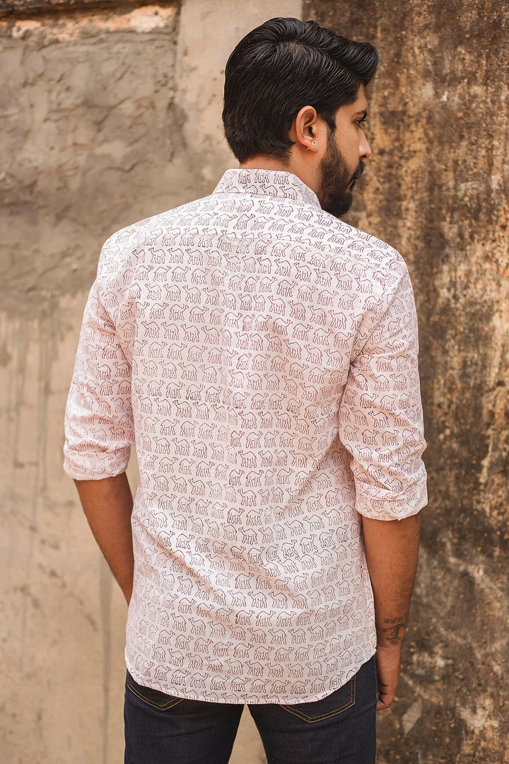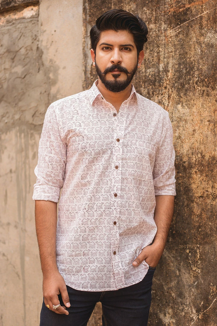 Look handsome and stay comfortable in this full-sleeved shirt featured with regular spread collar. Fashioned from cotton fabric, this shirt comes with blockprint camel print all over.Â