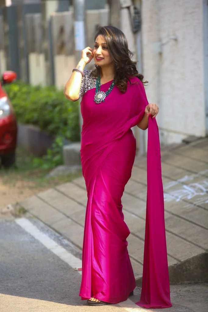 Soft and flowy plain crepe silk saree. The fabric is extremely easy to drape. It is non transparent and can be easily worn as single pleat.